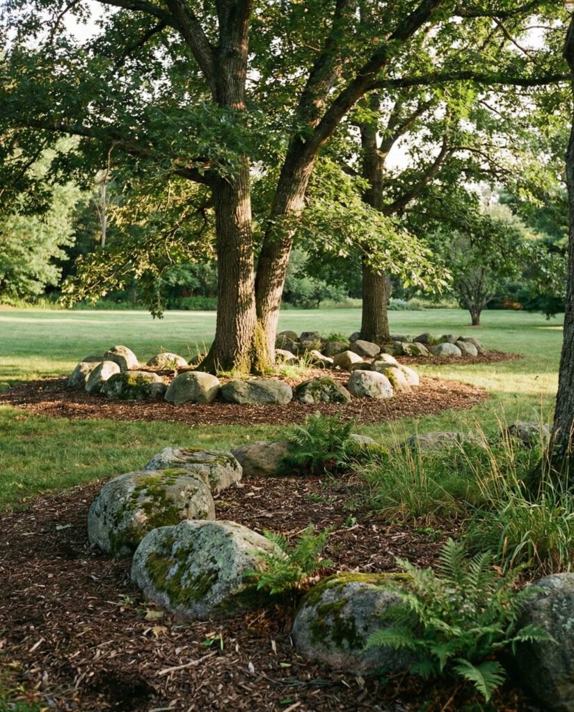 Large rocks placed and trees highlight trunks and root zones while protecting them from mowers and foot traffic. This technique feels timeless and works across styles. I’ve noticed it gives young trees instant presence and helps older ones feel respected rather than crowded. Stone framing also simplifies maintenance while elevating the overall landscape.