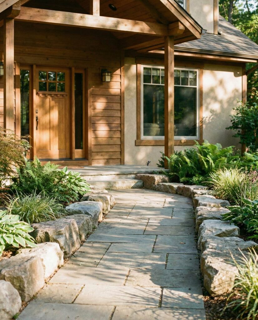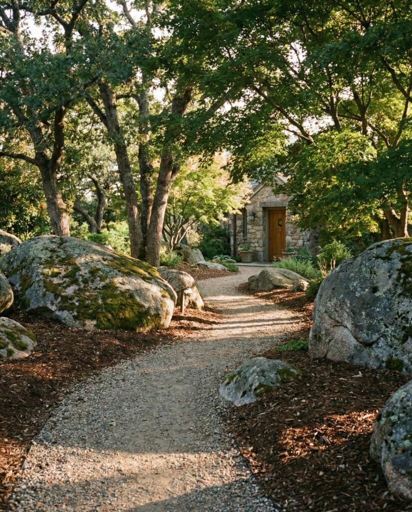 Large rocks used as a Border along garden paths add clarity without formality. Instead of edging materials, stone naturally guides movement through the Yard. I’ve seen this idea work especially well near an Entryway, where rocks subtly direct guests toward the House. Combined and trees or low shrubs, the path feels immersive and grounded. This style suits homeowners who want structure without rigid lines, letting the landscape feel organic and walkable.