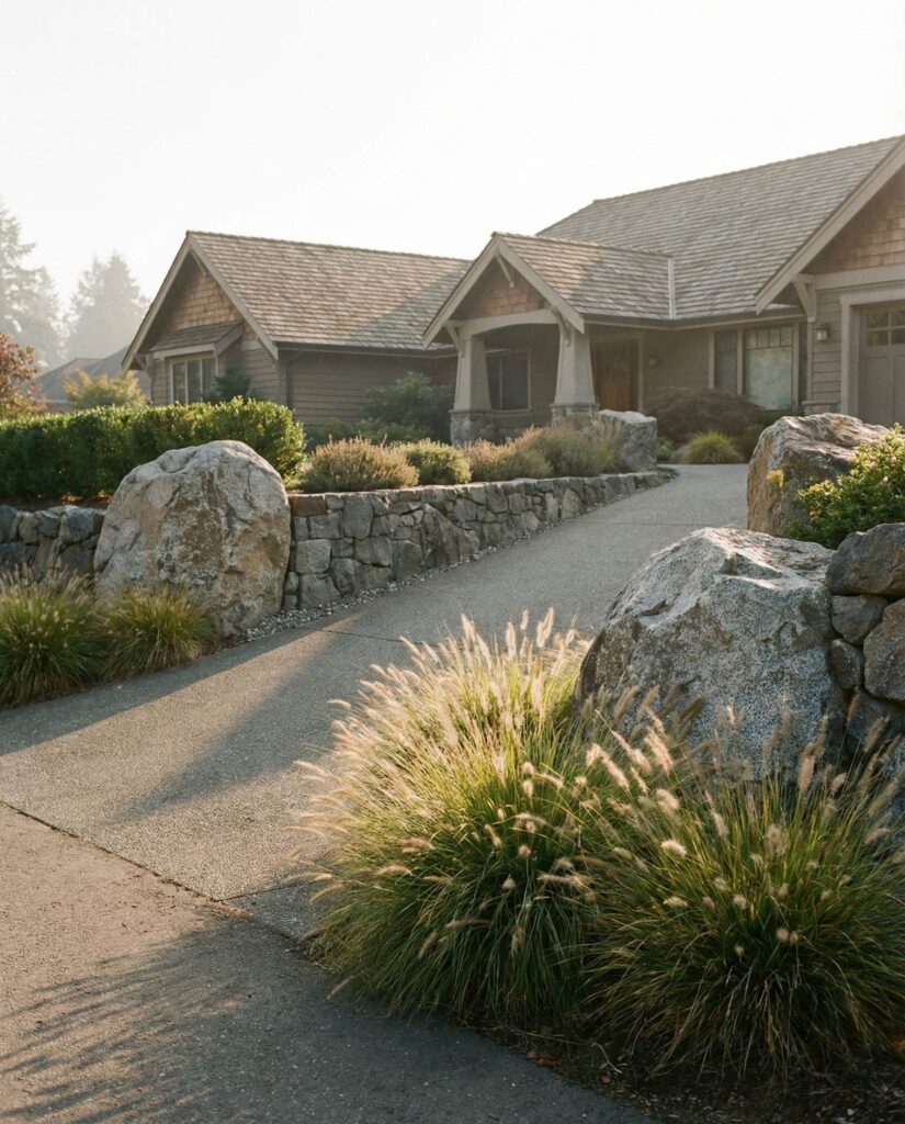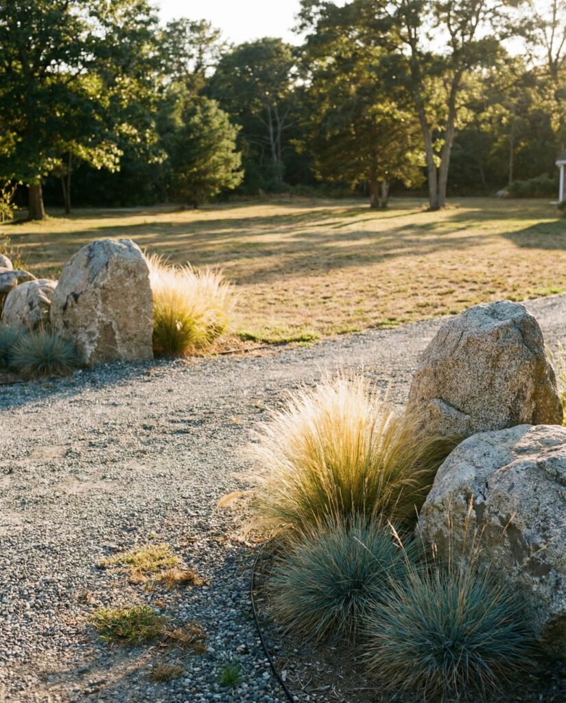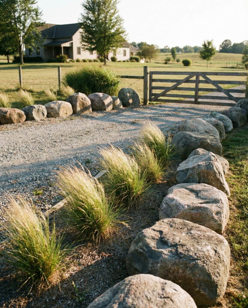 Placing large rocks along the edge of a Driveway entrance serves both form and function. These stones prevent vehicles from drifting into planting beds while visually anchoring the Front yard. I’ve noticed this solution feels less harsh than curbs and more in tune with a natural landscape. Paired and grasses, the rocks soften the transition between pavement and Yard, especially effective near rural or semi-rural Farmhouse properties.
