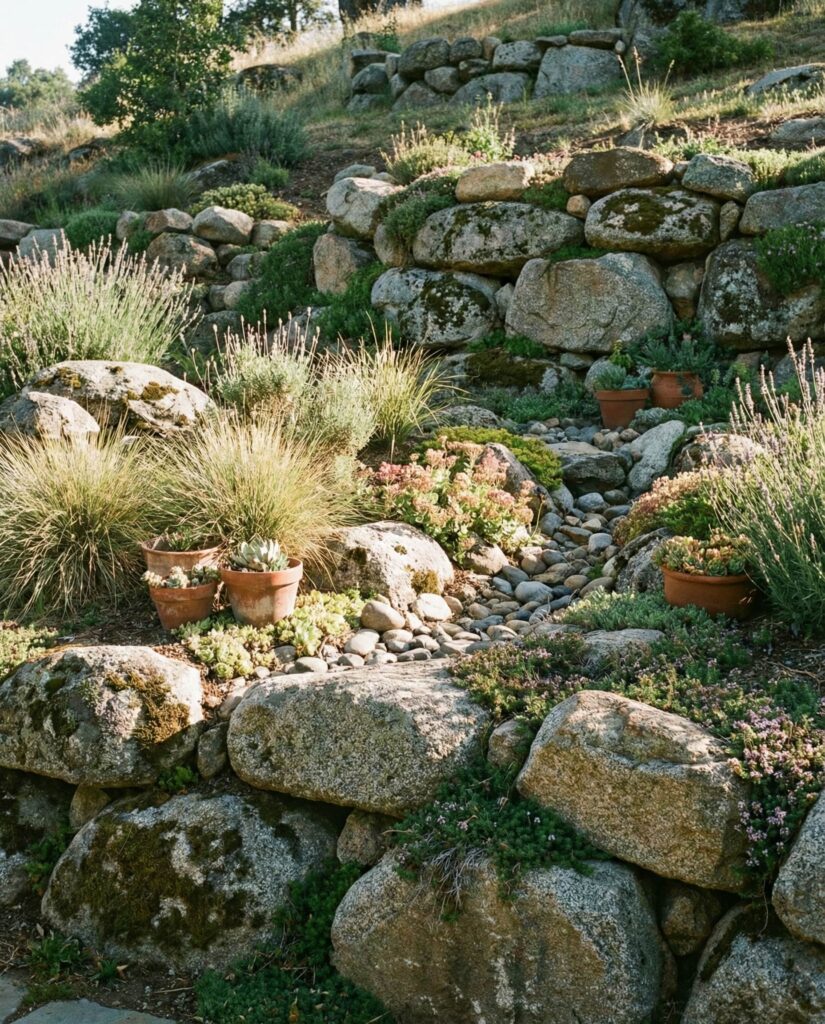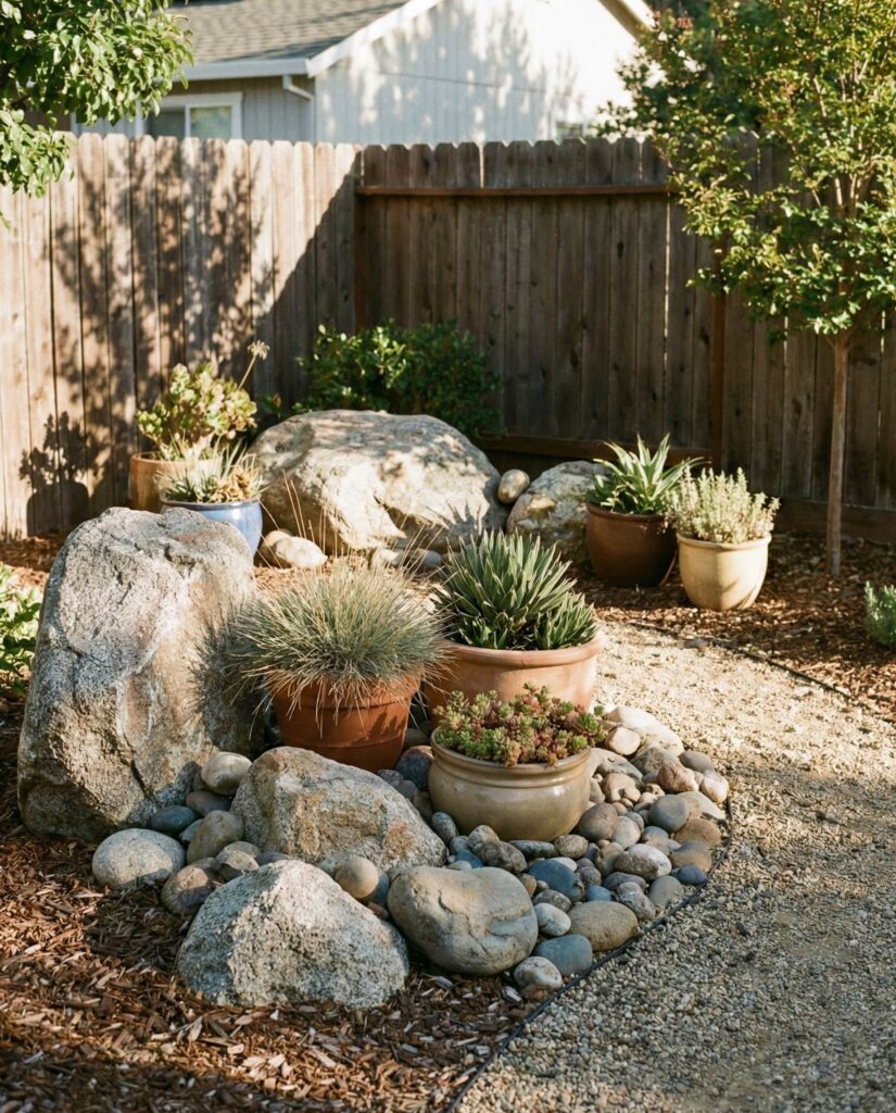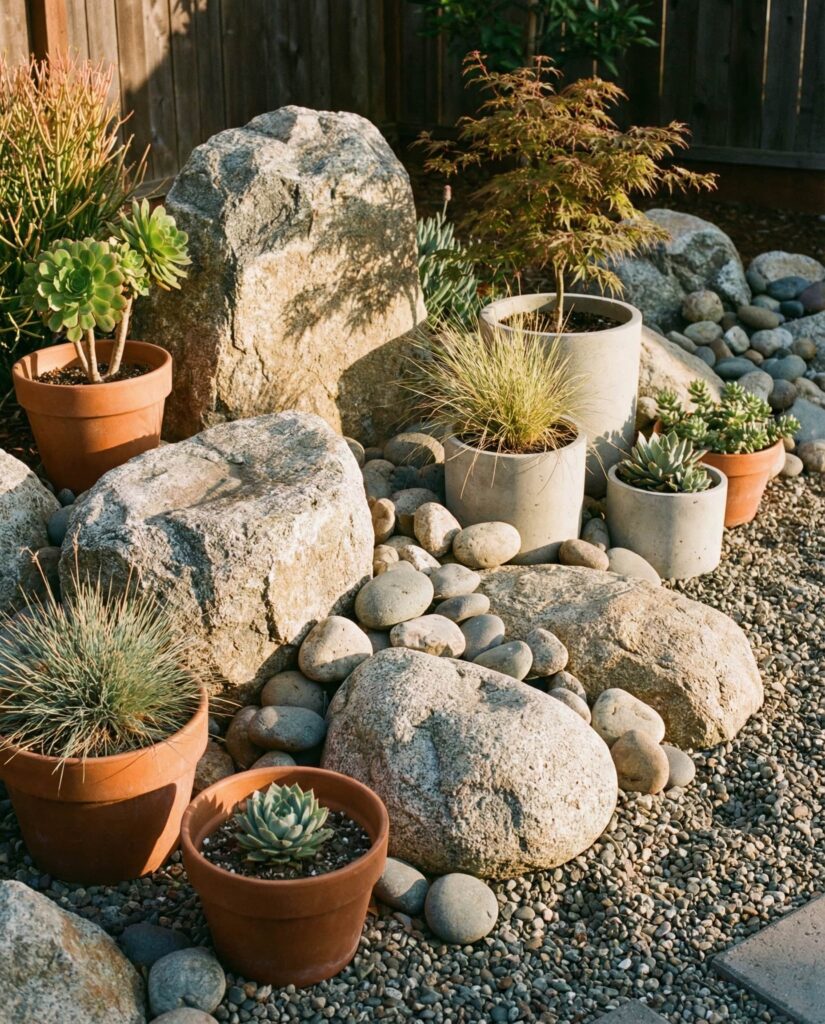 Using large rocks and pots together creates flexibility within permanence. The stone anchors the design, while pots allow seasonal change. I’ve seen homeowners use this approach near patios or transitions between hardscape and garden. It works especially well where soil quality is poor or space is limited. Rocks provide structure, pots add personality.