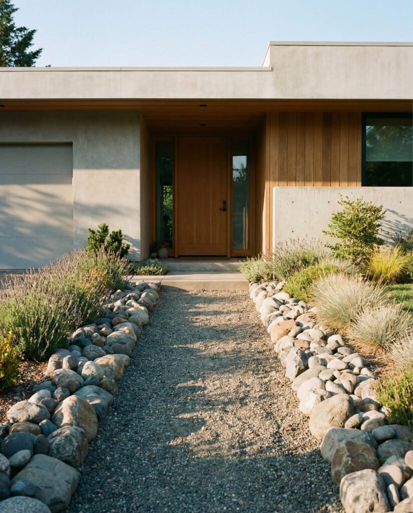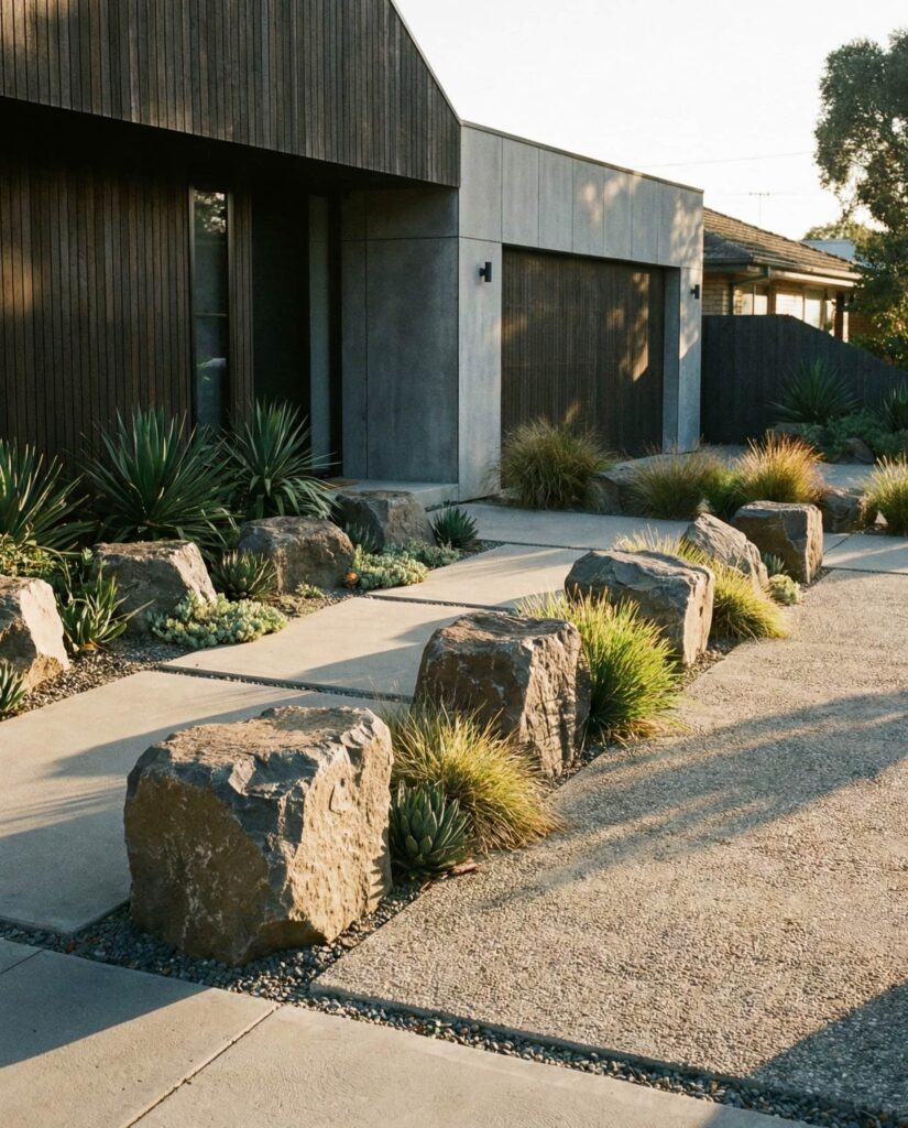 Placing rocks to echo the lines of a Modern House creates dialogue between architecture and landscape. I’ve noticed designers align stone groupings with walls or windows, reinforcing geometry without copying it. This approach works best in the Front yard, where first impressions matter. Rocks add weight and permanence, grounding even minimalist homes.