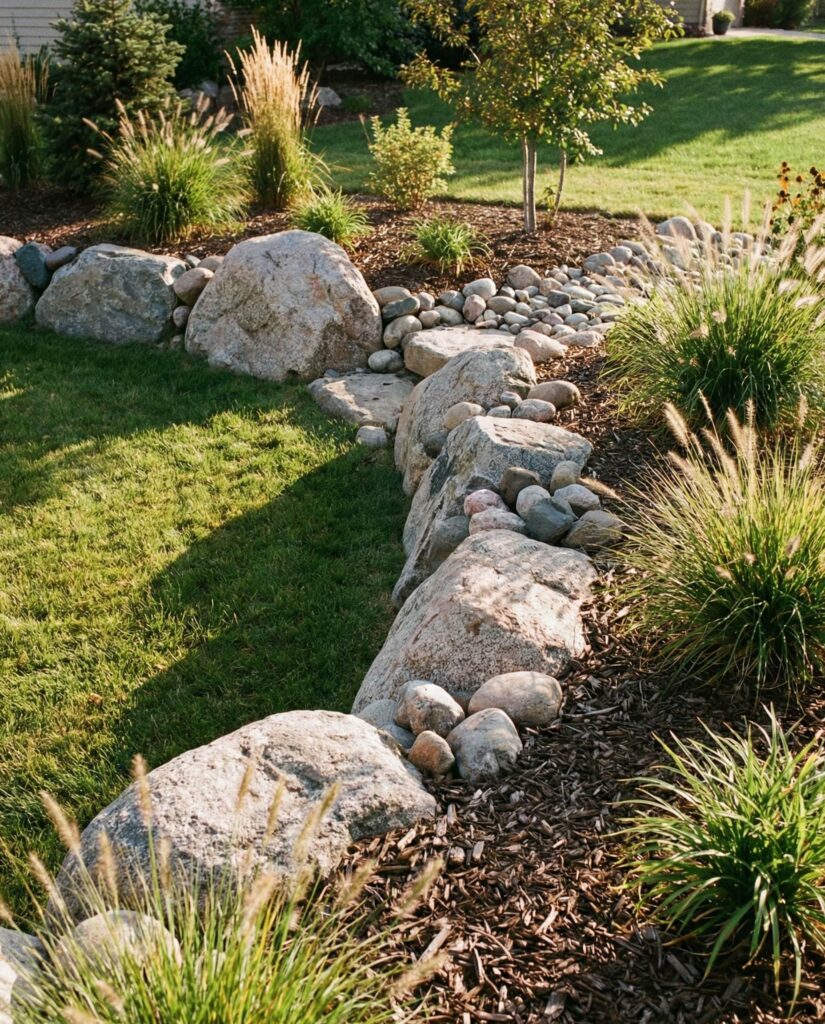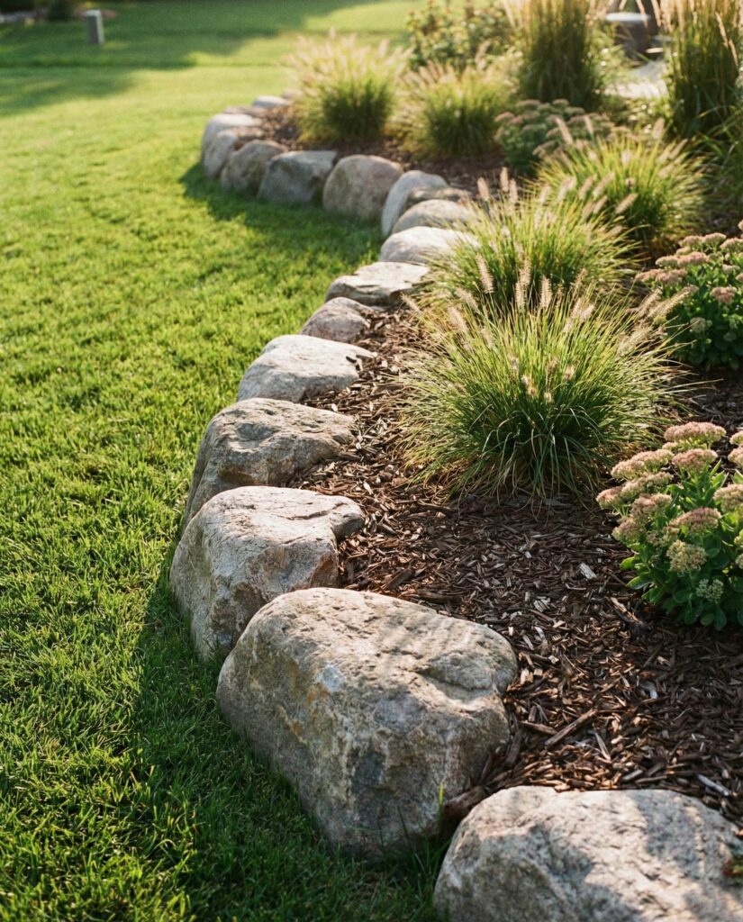 Large rocks excel at marking transitions between open lawn and planted areas. Instead of abrupt edges, stone creates a gradual shift that feels natural. I’ve seen this used effectively in family Backyard spaces, where kids and pets move freely. Rocks protect garden beds and mulch while keeping the Yard visually cohesive.