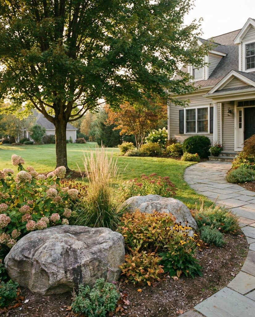In climates with strong seasonal change, large rocks act as visual anchors year-round. While plants come and go, stone keeps the landscape readable in winter and lush in summer. I’ve noticed homeowners appreciate this stability, especially in open Front yard designs. Rocks paired and trees ensure the House never feels exposed, regardless of season.