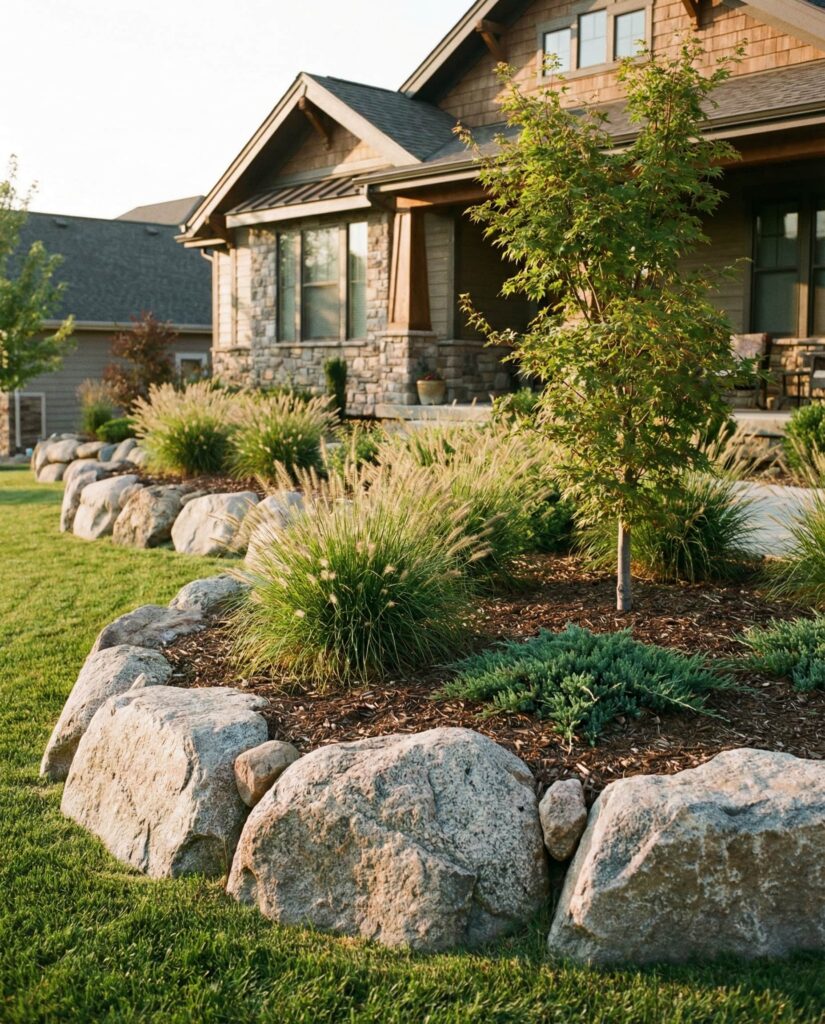 Using large rocks as a Border around the Front house creates a clear visual frame without fencing. This idea works especially well in the Front yard, where stone outlines planting beds while keeping the House visually grounded. I’ve noticed designers often combine rocks and mulch to reduce maintenance and highlight architectural lines. When paired and trees or low Grasses, the effect feels calm and natural, not ornamental. This approach suits homeowners who want structure without rigidity, especially in Full sun areas where plants alone struggle. The rocks quietly protect root zones, prevent soil erosion, and give the Front of the property a sense of permanence that matures beautifully over time.