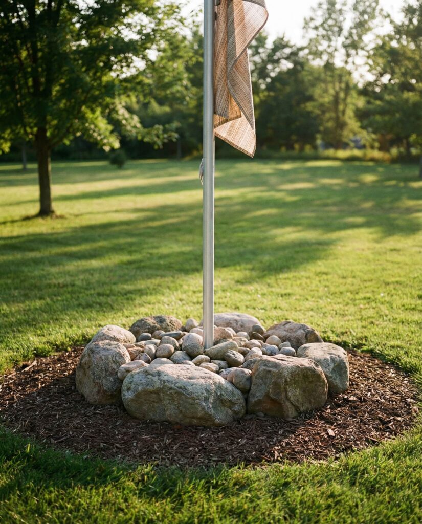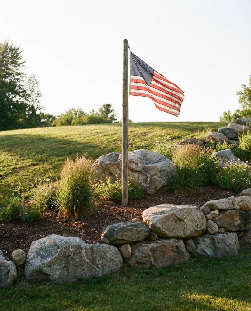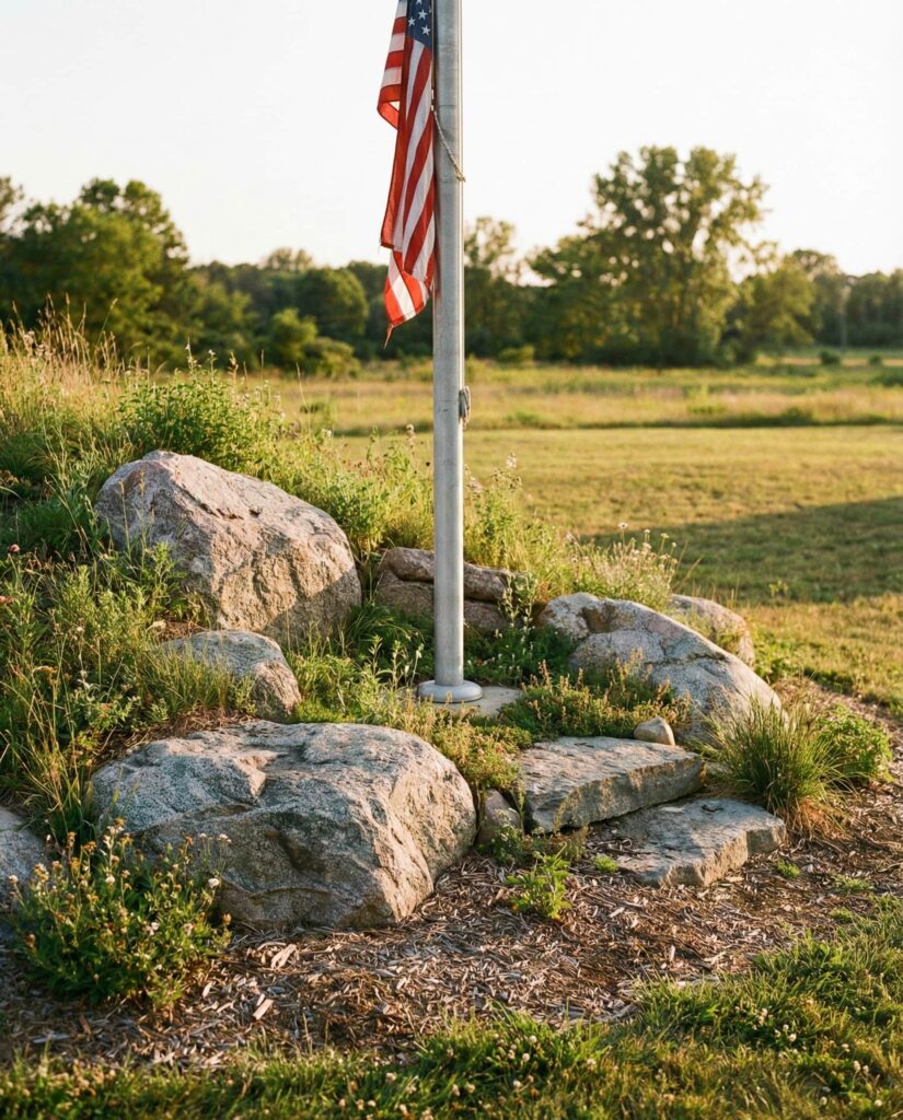 A Flag pole needs visual weight to feel balanced, and large rocks provide exactly that. Stone prevents the pole from looking isolated while reducing soil erosion at its base. I’ve seen this done beautifully in both suburban and rural settings, especially near long driveways. Rocks keep maintenance low and ensure the flag remains the focal point without excessive planting.