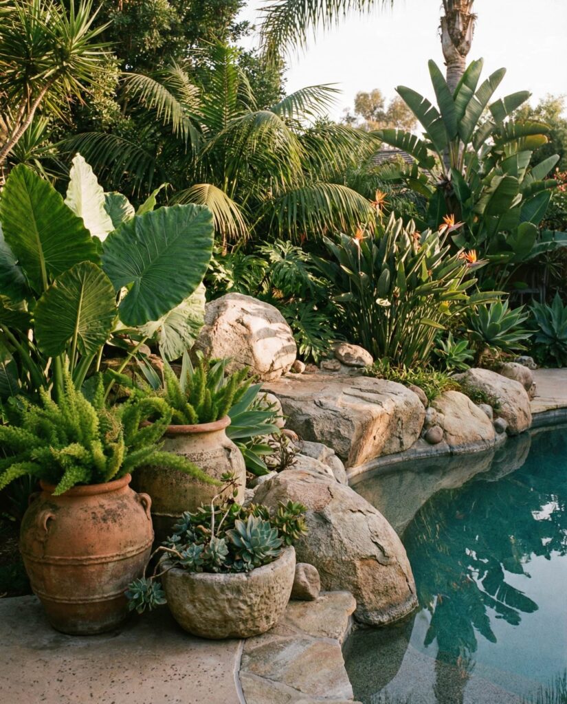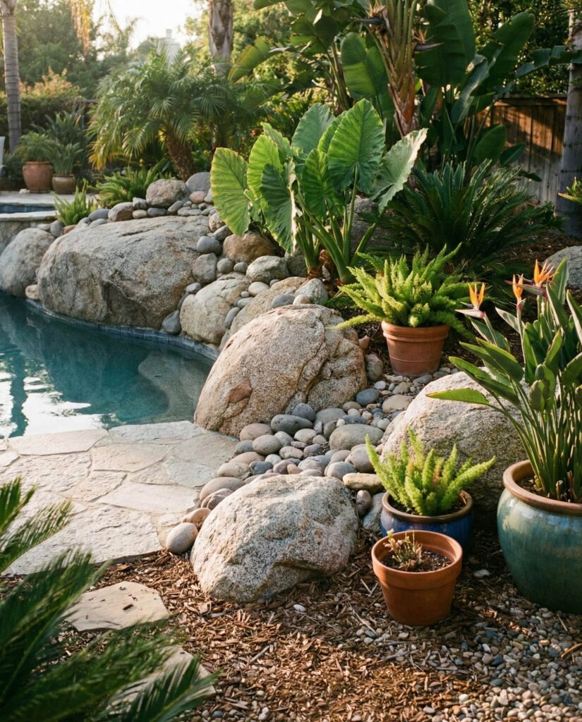 A Corner of the Backyard near a Pool is often awkward to landscape, making large rocks an ideal solution. Stone fills space without clutter and creates a visual anchor around pool edges. I’ve observed this approach bring balance to outdoor layouts, especially when paired with Tropical plants or simple greenery. Rocks help guide movement, protect planting beds, and soften hard pool lines. Combined and pots for seasonal accents, the area feels intentional rather than leftover. This solution keeps maintenance low while making the Outdoor space feel cohesive and thoughtfully designed.