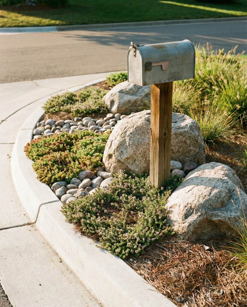 The Mailbox is often overlooked, yet it’s one of the most visible parts of a Yard. Large rocks placed at a Corner anchor the space and protect plantings from traffic. I’ve seen this approach elevate even modest homes, especially when stone is paired with simple groundcover. It creates a finished look without ongoing maintenance and helps the mailbox feel like part of the landscape, not an afterthought.