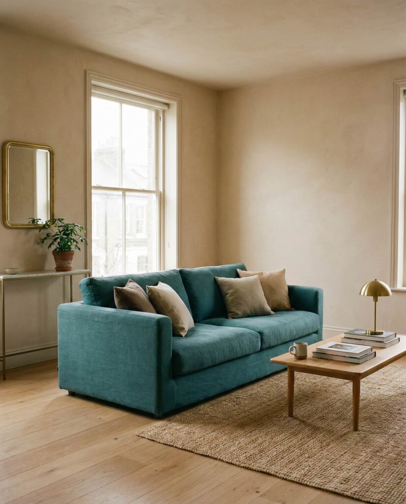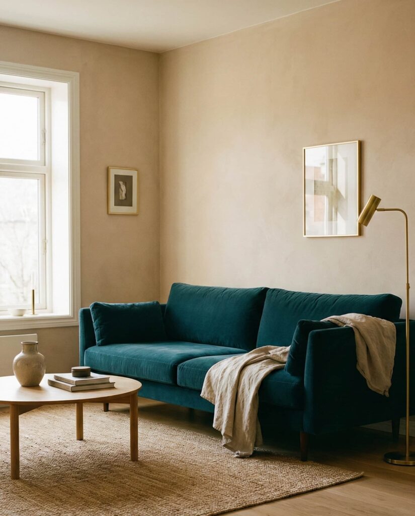 A living room built around a Teal sofa paired with Beige walls is emerging as one of the most versatile Modern home decor ideas for 2026. Teal offers depth without feeling heavy, while beige keeps the space open and livable. I’ve noticed this palette works especially well in apartments with limited natural light, where teal adds character and beige prevents the room from turning Moody. Designers often recommend brushed brass or oak accents to warm things up. This combination feels intentional but not trendy, making it ideal for homeowners who want longevity. It also fits seamlessly into House painting ideas interior discussions, as beige remains a safe yet elevated wall choice.