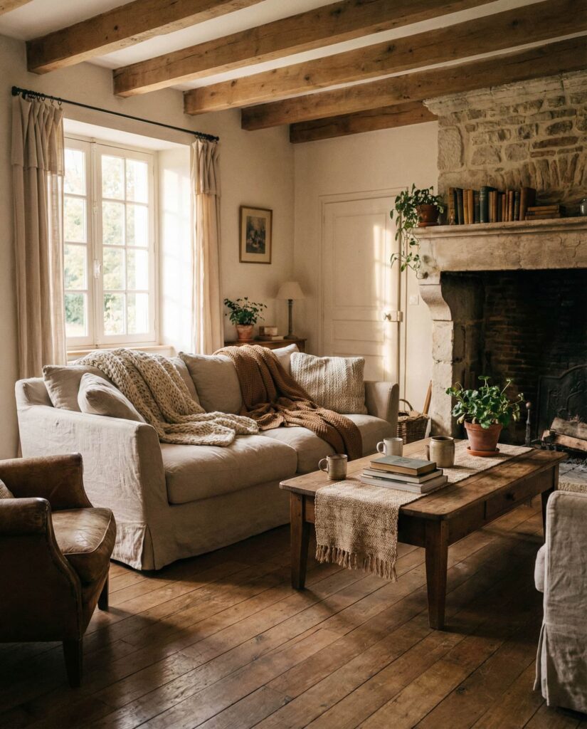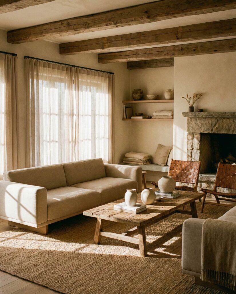 This palette combines rustic materials with clean, modern silhouettes, echoing Rustic modern sensibilities without repeating earlier looks. Neutral colors dominate, while texture provides warmth. I’ve noticed this approach works especially well in renovated homes where old and new coexist. The living room feels authentic rather than themed, grounded yet current.