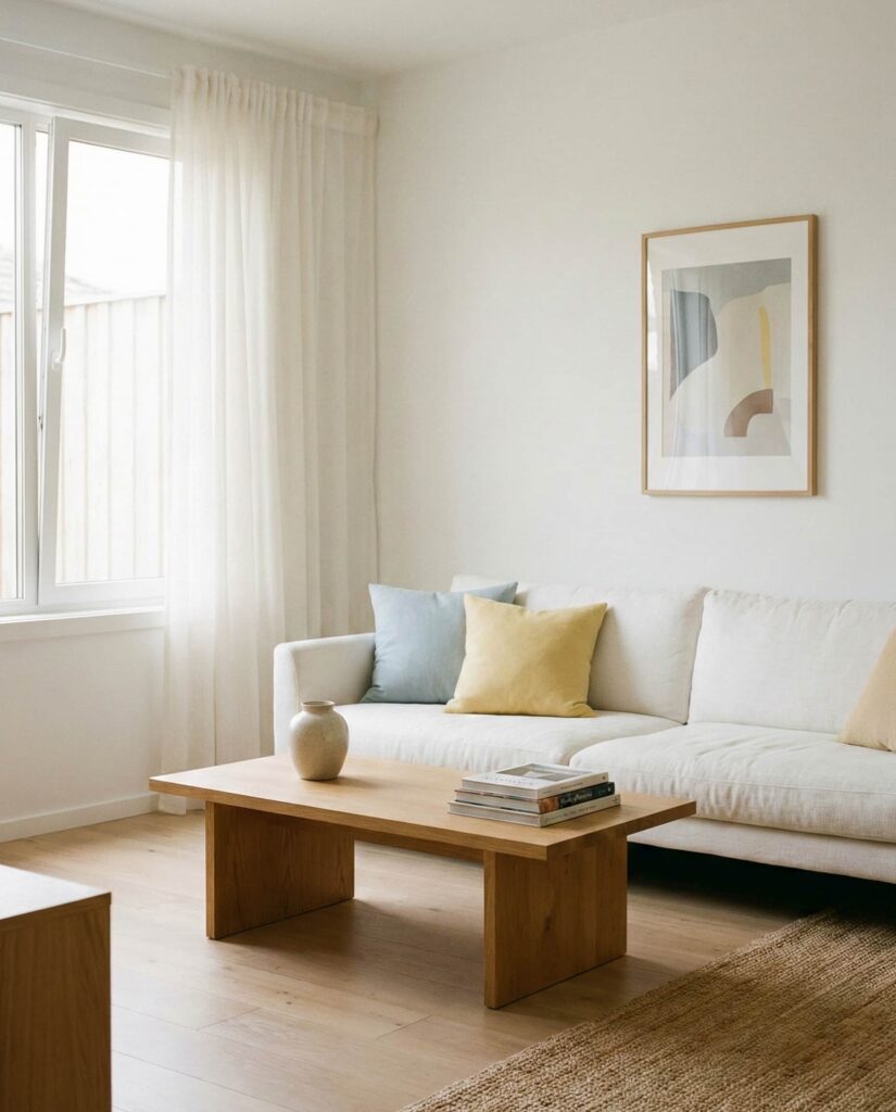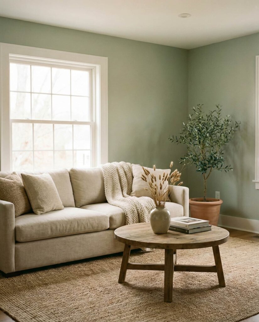The Japandi aesthetic continues to influence living room palettes, especially when soft neutrals meet muted Green accents. This style values restraint, quality, and calm. Light wood, linen textures, and subtle green elements create a space that feels intentional and restorative. I’ve noticed homeowners gravitating toward this palette as a response to visual overload. It’s particularly effective in open-plan homes where flow matters more than contrast.