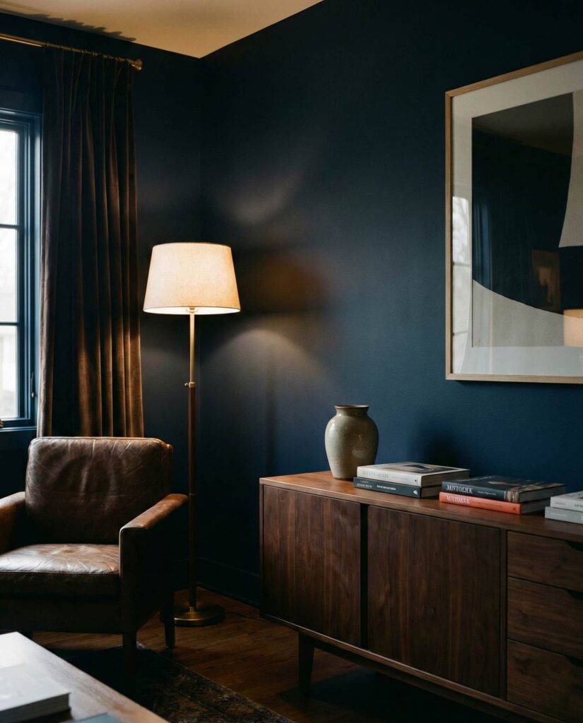 A Moody living room anchored in deep Blue tones and dark wood details reflects a growing interest in intimate, atmospheric spaces. This palette works especially well in larger living rooms where darker colors won’t feel enclosing. Designers often suggest grounding the look with warm wood furniture or shelving to keep the space inviting. I’ve seen this style resonate with homeowners who enjoy evening entertaining or quiet nights in. The effect is dramatic but controlled, proving that darker palettes can still feel welcoming.