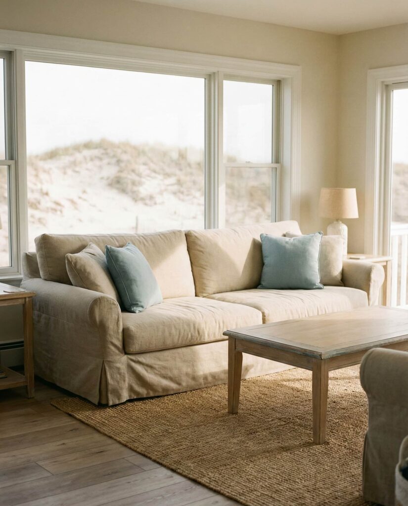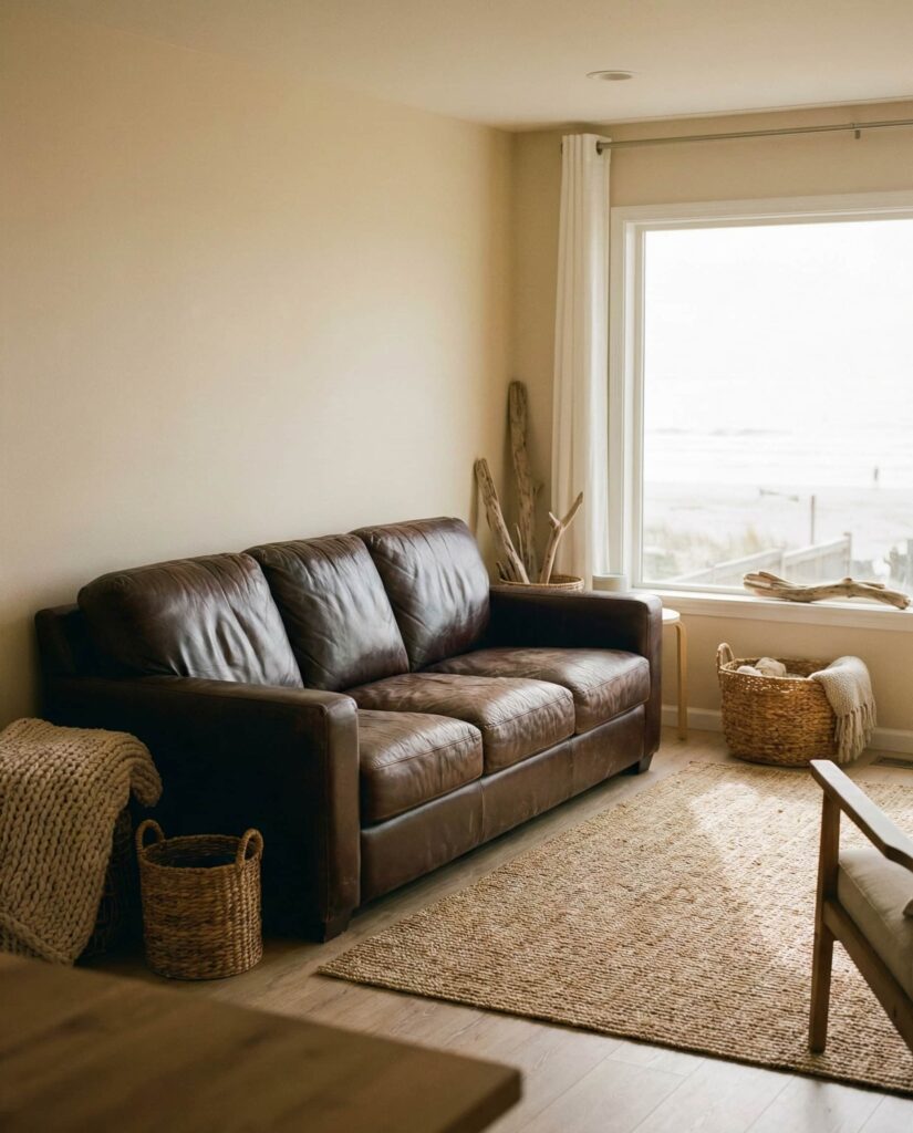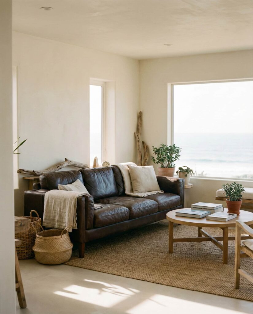 A Dark brown leather couch paired with soft coastal neutrals creates an unexpected but compelling Coastal palette. Light walls, sandy tones, and natural textures keep the leather from feeling heavy. This approach works well in family homes where durability matters. Designers often recommend this mix for its ability to age gracefully while still feeling relaxed. It’s coastal without clichés, grounded yet airy.