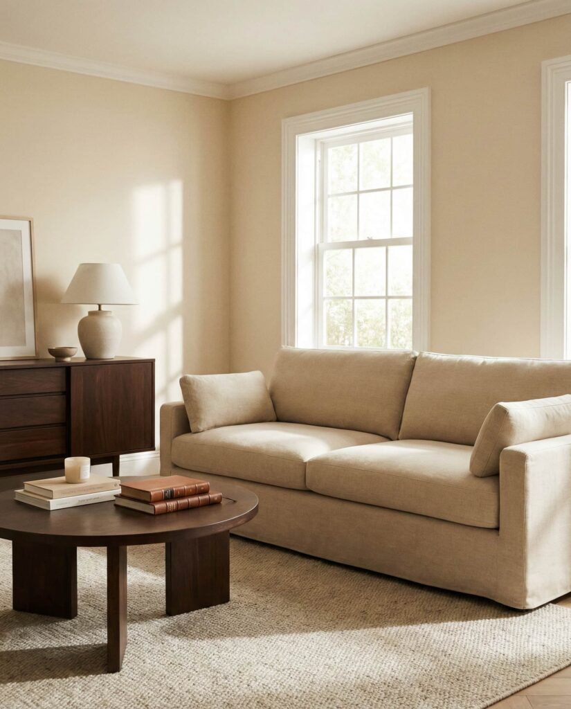 A living room anchored in Beige with carefully placed dark accents offers a refined yet approachable look. Beige walls and seating provide warmth and flexibility, while darker elements—like metal lighting, wood tables, or accent chairs—add definition. I often see this palette recommended for homeowners who want structure without committing to bold color. It works particularly well in transitional spaces where styles overlap. The contrast keeps the room visually interesting while remaining timeless. This approach feels intentional, practical, and well-suited for long-term living rather than short-lived trends.