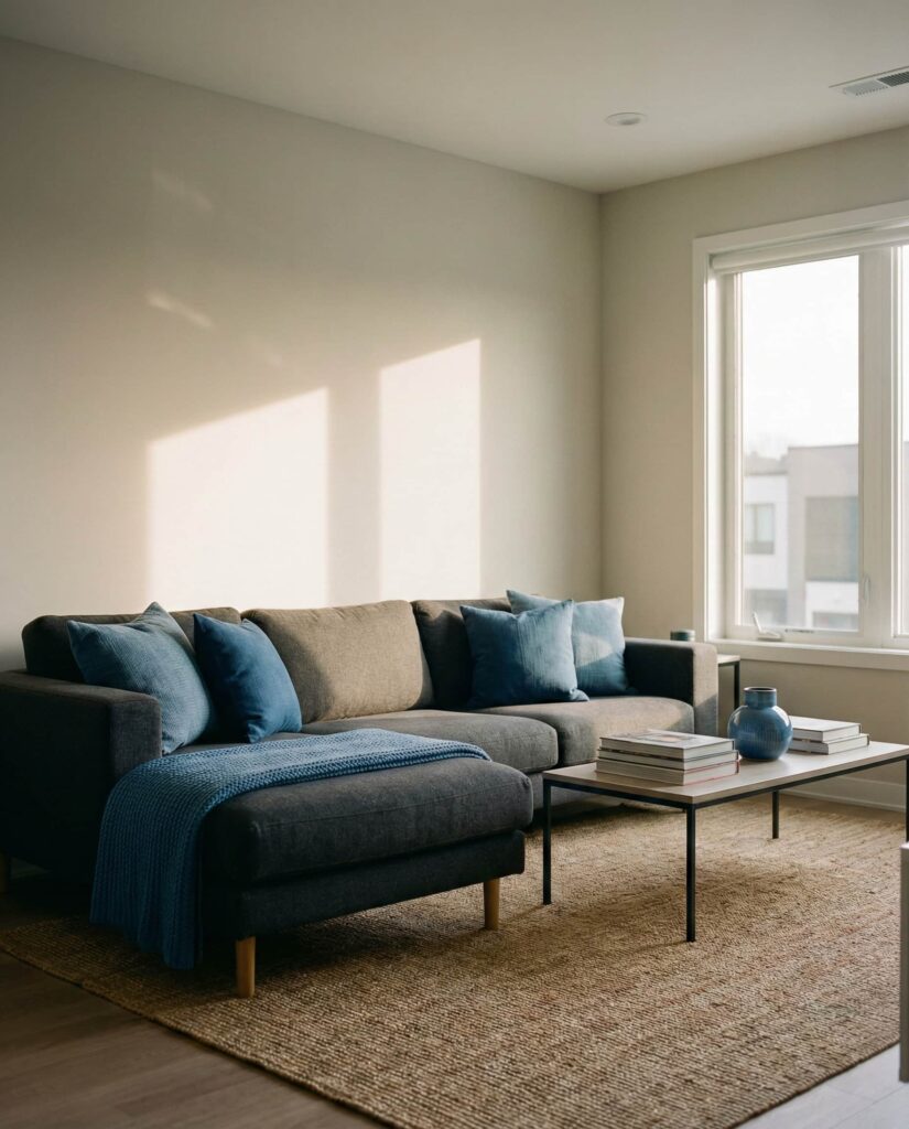 Pairing a Charcoal sofa with layered Blue tones creates a refined, contemporary living room that feels confident without being cold. This palette is increasingly popular in urban condos, where darker seating grounds open layouts. Charcoal anchors the room, while blue—used in art, pillows, or accent walls—keeps the space from feeling too heavy. The result is a look that feels slightly Moody but still approachable. Interior editors often highlight this combination for its flexibility across seasons, especially when paired with lighter wood or stone finishes.