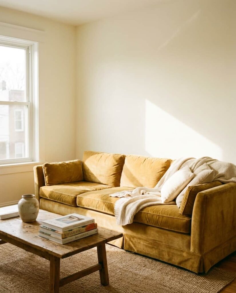 A Gold couch instantly transforms a living room into a statement space, especially when paired with Bright neutrals like soft white or pale sand. While bold, this palette is surprisingly livable when the rest of the room stays restrained. I’ve seen designers use gold upholstery in otherwise simple spaces to create personality without clutter. This approach aligns with newer Modern home decor ideas that favor one strong focal point. It works best in rooms with good daylight, where gold reads warm rather than flashy.