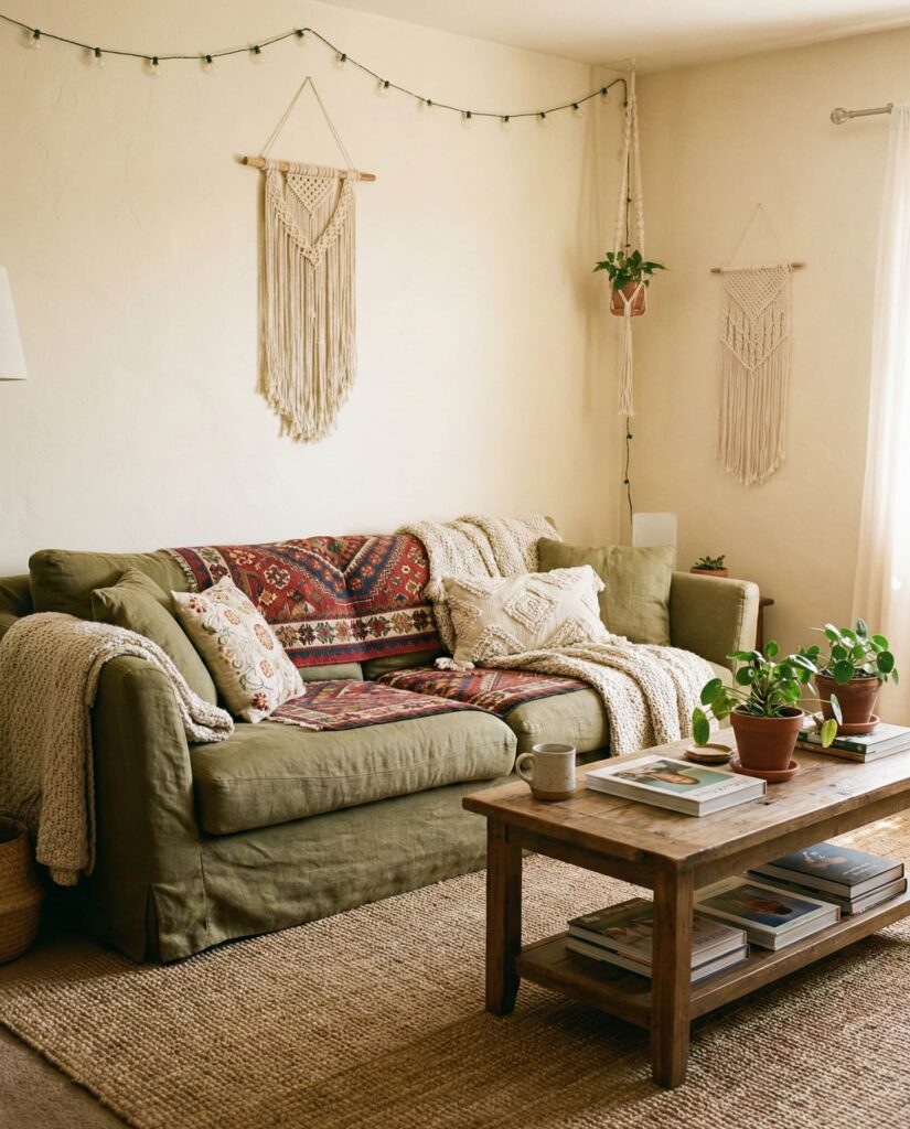 An Olive sofa paired with layered textures defines the relaxed Boho direction many homeowners are embracing. Olive sits beautifully between neutral and color, making it easy to style with creams, terracotta, or wood tones. This palette feels lived-in, not styled, which is why it resonates with younger families and creatives alike. Designers often recommend mixing patterns subtly to keep the look cohesive. The result is casual, expressive, and deeply personal.