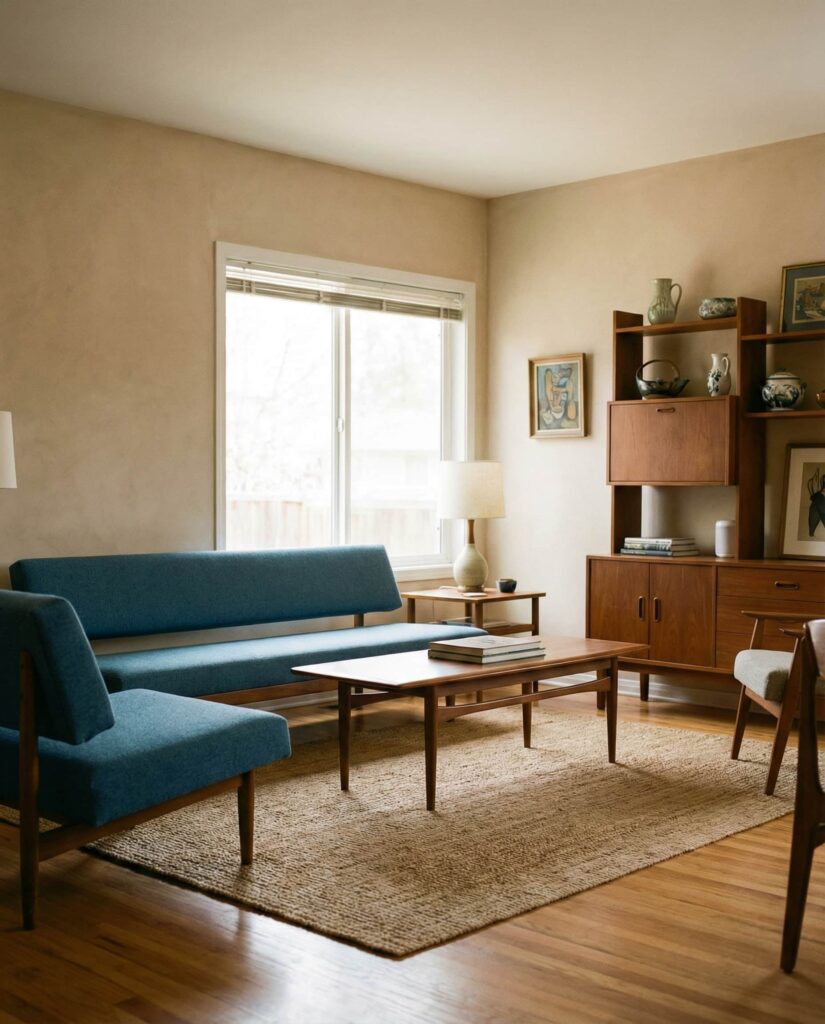 A Mid-century modern palette built on Blue and Beige continues to feel relevant because it balances structure and softness. Blue sofas or accent chairs paired with beige walls create a familiar yet fresh look. This combination works especially well in smaller living rooms, where visual clarity matters. I’ve seen it used successfully in both rentals and long-term homes, proving its adaptability. Warm wood finishes complete the look without overpowering it.