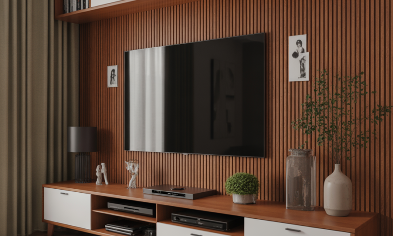 Blending Modern, wood, and minimalist aesthetics, this idea uses warm wood panel textures to soften the TV area and bring harmony to an Apartment or larger home. The clean lines give the illusion of a small space that feels open and simple, and many homeowners love the natural calm it adds. I’ve seen friends instantly relax once they switched from paint to full-panel walls.