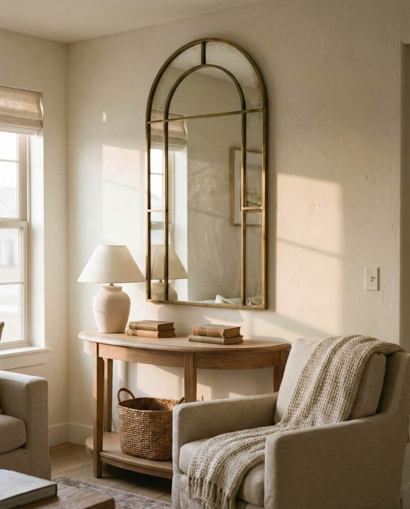 Arched mirrors continue to gain popularity as a softer alternative to sharp geometry. Used in hallways or between rooms, they gently guide the eye and create flow. I’ve seen this style favored in homes blending classic and modern influences, especially when paired with Vintage furniture. The curve introduces calm while still reflecting light effectively. This idea suits homeowners who want character without committing to ornate detailing, making it a versatile choice for evolving interiors.