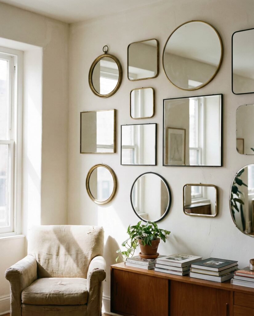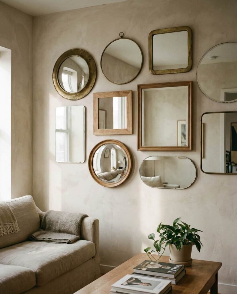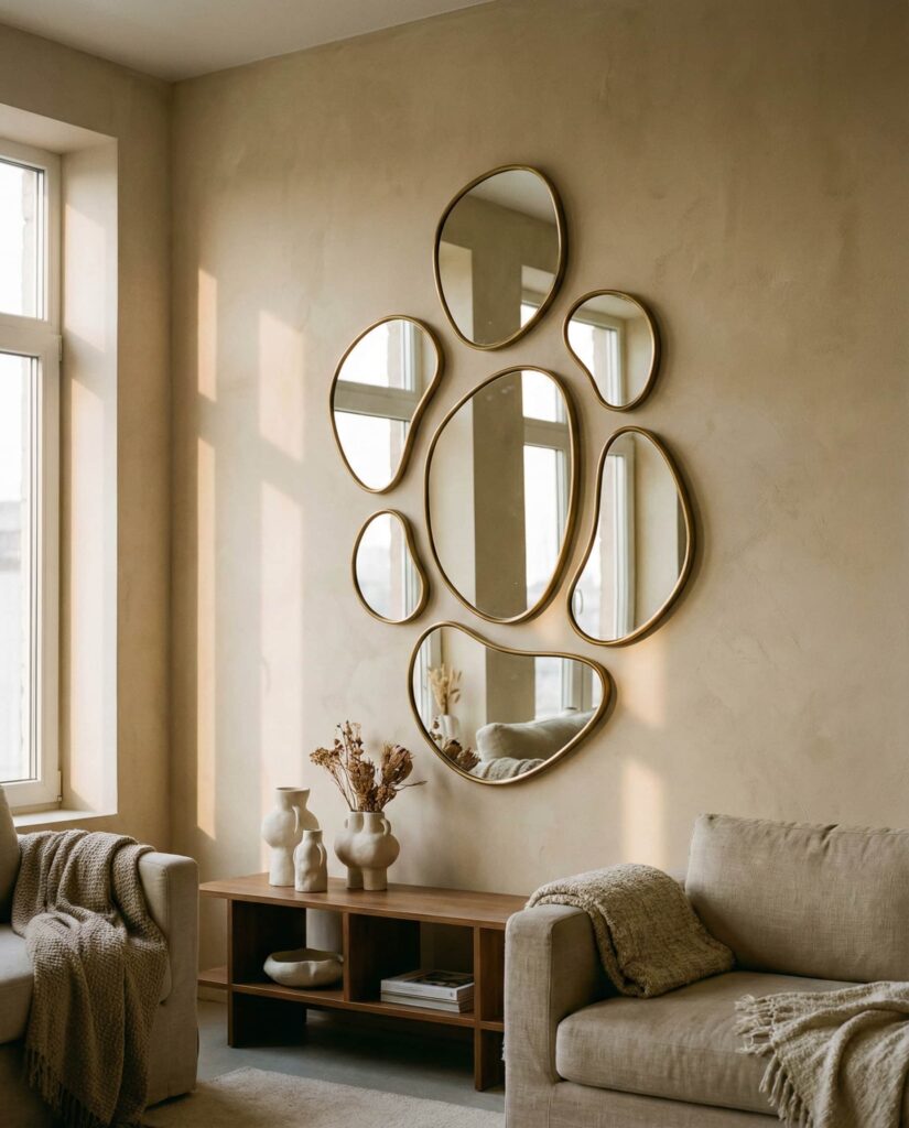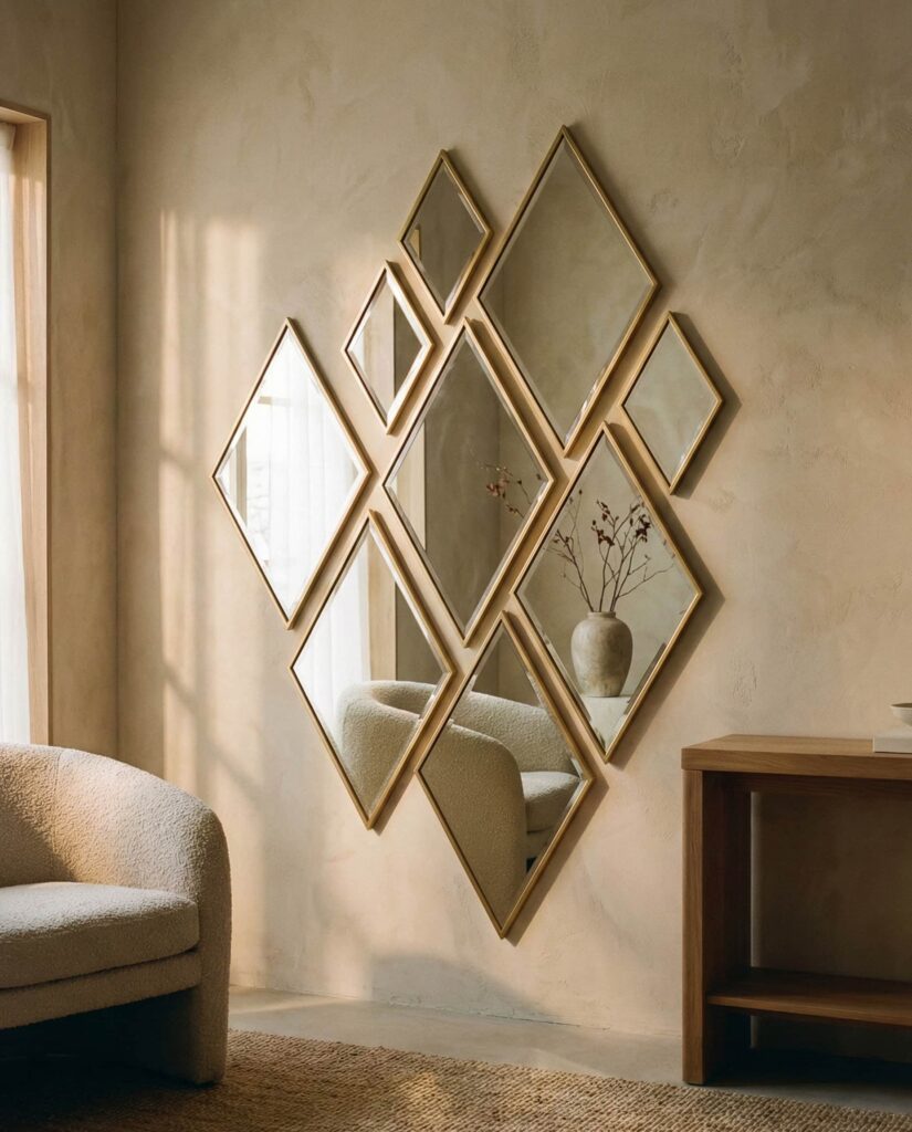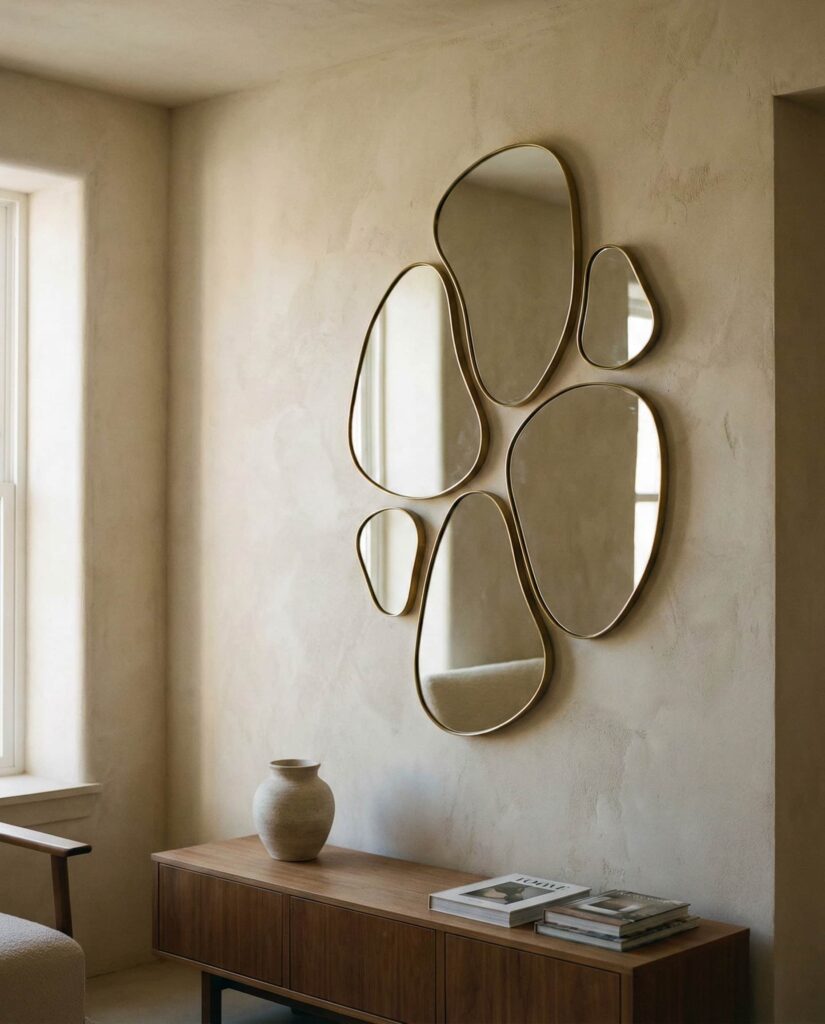An Abstract mirror arrangement works like wall art, especially in creative homes. These pieces often mix irregular shapes, turning reflection into expression. I’ve seen them used effectively in lofts where traditional art felt too predictable. The mirror becomes a conversation starter, blurring the line between décor and sculpture. This idea suits homeowners who want individuality without committing to bold color.
