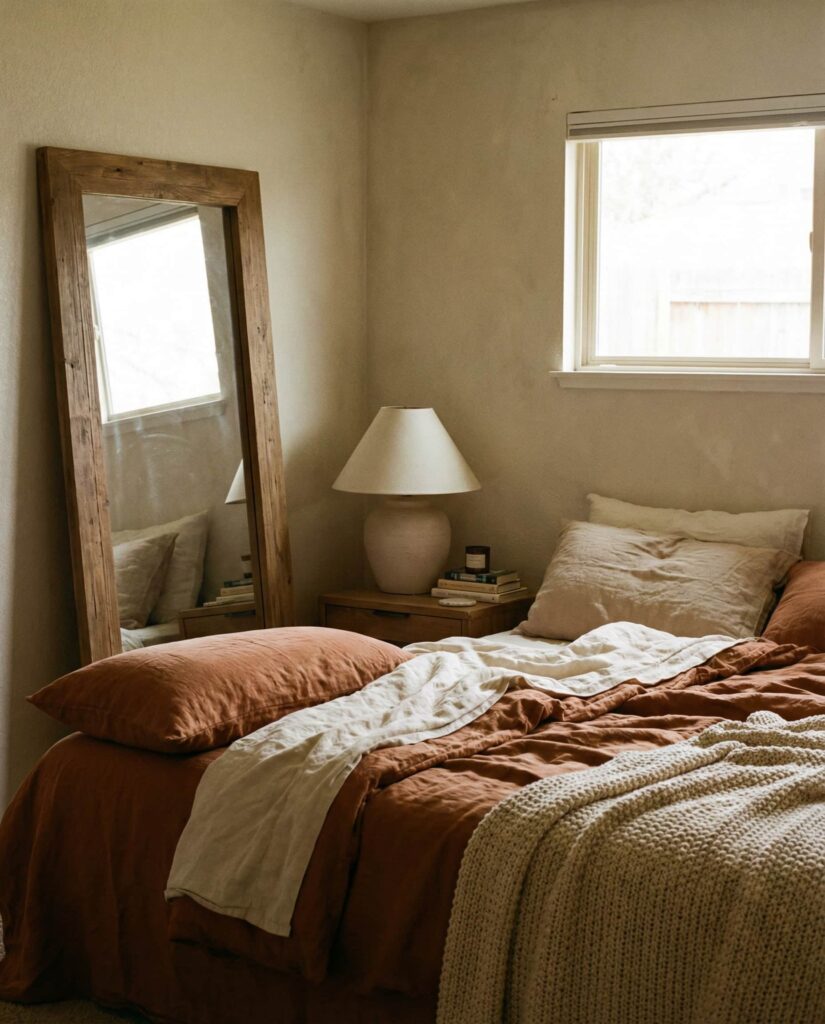 A solid Wooden frame brings grounding warmth to bedroom spaces. Used in Bedroom ideas aesthetic, these mirrors complement soft lighting and natural textiles. I’ve noticed that darker woods feel intimate, while lighter tones keep rooms airy. This style supports relaxed routines, making bedrooms feel lived-in rather than staged. It’s a dependable choice for long-term comfort.