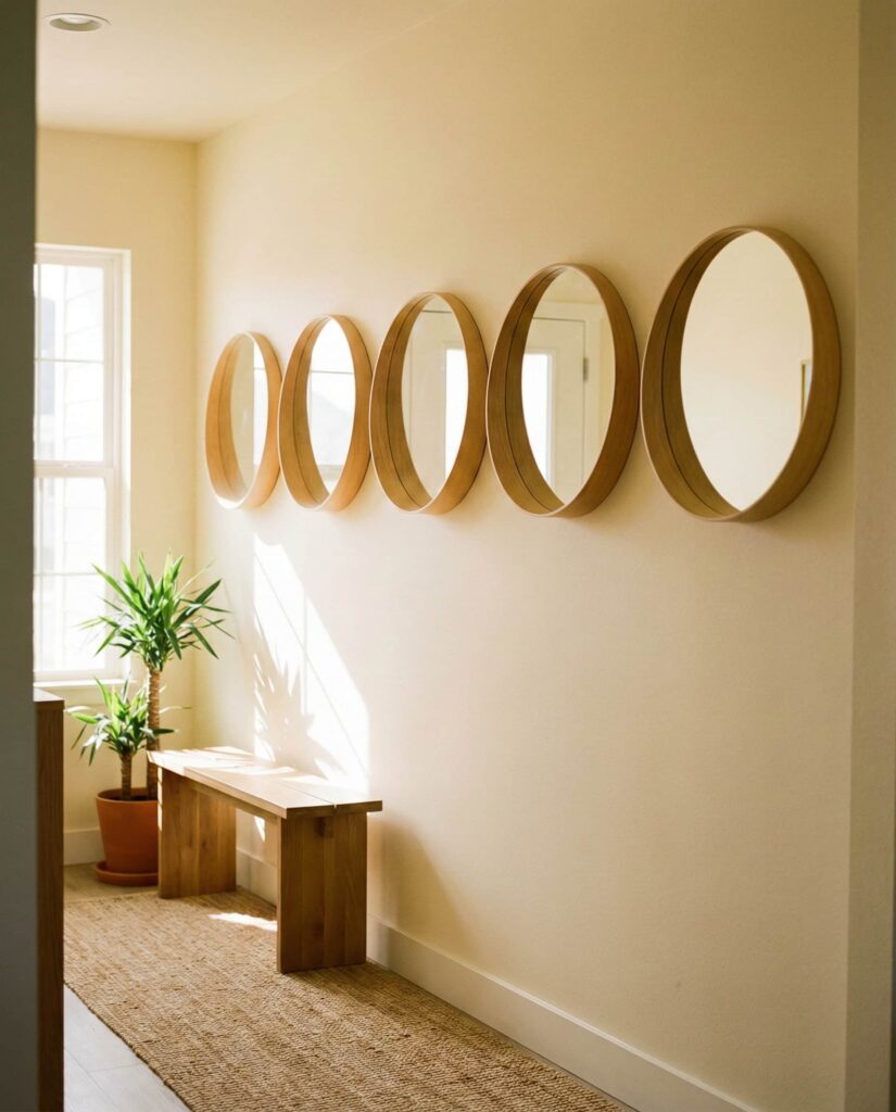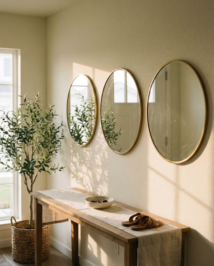 Using multiple Circle mirrors in a vertical or horizontal line adds rhythm to an Entrance wall. I’ve seen this technique create a welcoming first impression without overcrowding the space. The repetition feels intentional and modern, especially when frames are consistent. It’s a subtle way to elevate transitional areas that are often overlooked in design planning.