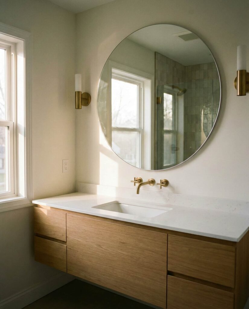 The Bathroom has embraced softer shapes, and the Circle mirror leads the trend. Round mirrors balance sharp tiles and fixtures, creating a spa-like calm. I’ve personally found that a simple round mirror above the sink makes small bathrooms feel more intentional. Whether frameless or subtly edged in Gold, the look feels clean and contemporary. Designers often mention how circles visually slow the eye, which is welcome in busy households. This approach prioritizes comfort without sacrificing style.