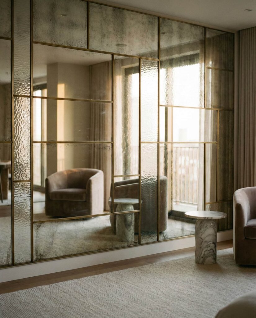Textured mirror panels add depth without bold patterns. Often used as accent walls, they introduce gentle distortion that feels artistic rather than distracting. I’ve seen this idea embraced in living and dining spaces where standard art felt unnecessary. The texture catches light differently throughout the day, giving the room quiet movement. It’s an understated yet sophisticated approach to mirror wall decor.