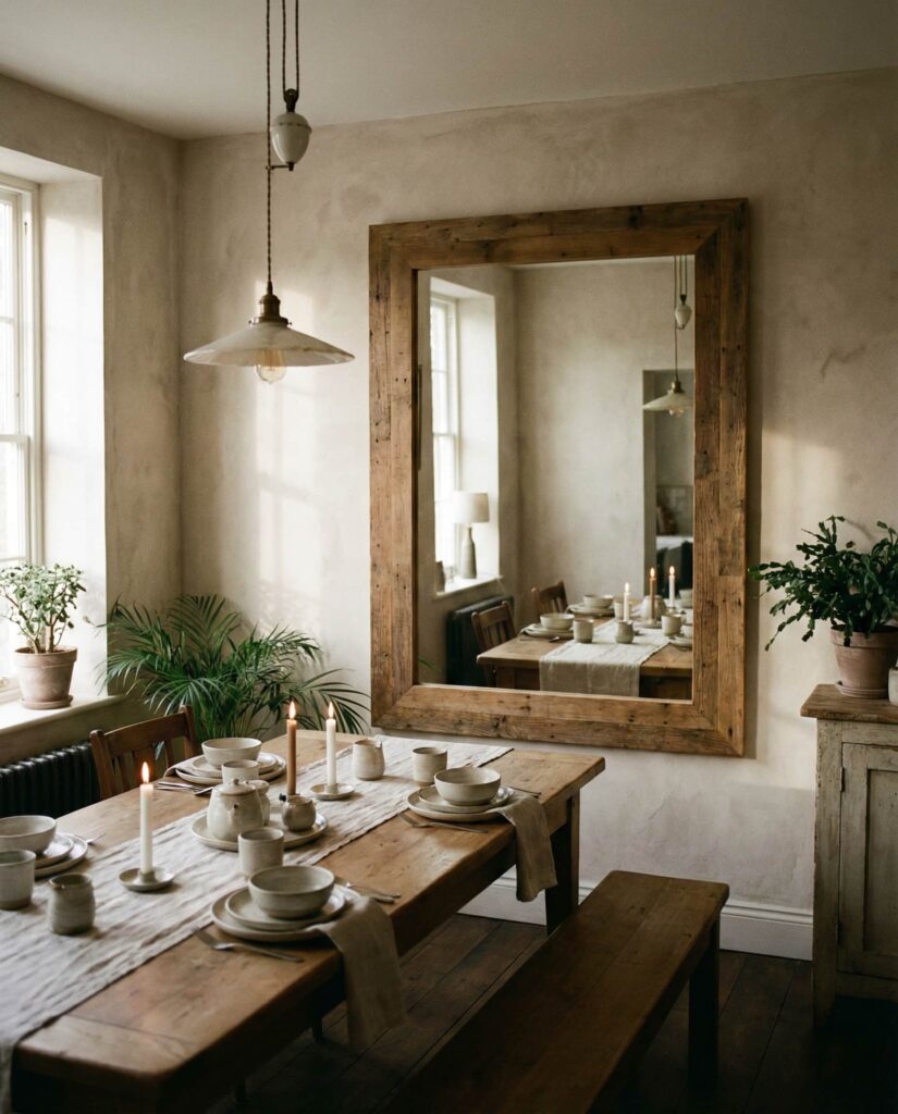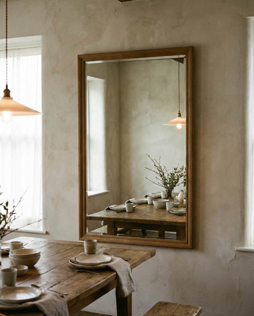 A large Rectangle mirror in the Dining room has become a quiet classic. Hung horizontally, it visually doubles the table setting and enhances evening light. Many designers prefer thin Wooden frames for warmth, especially in open-plan homes. I’ve seen this approach soften formal dining areas, making them feel more social and relaxed. The reflective surface amplifies candlelight and table décor, creating an atmosphere that feels both intimate and expansive. This idea suits homeowners who entertain often and want elegance without excessive ornamentation.