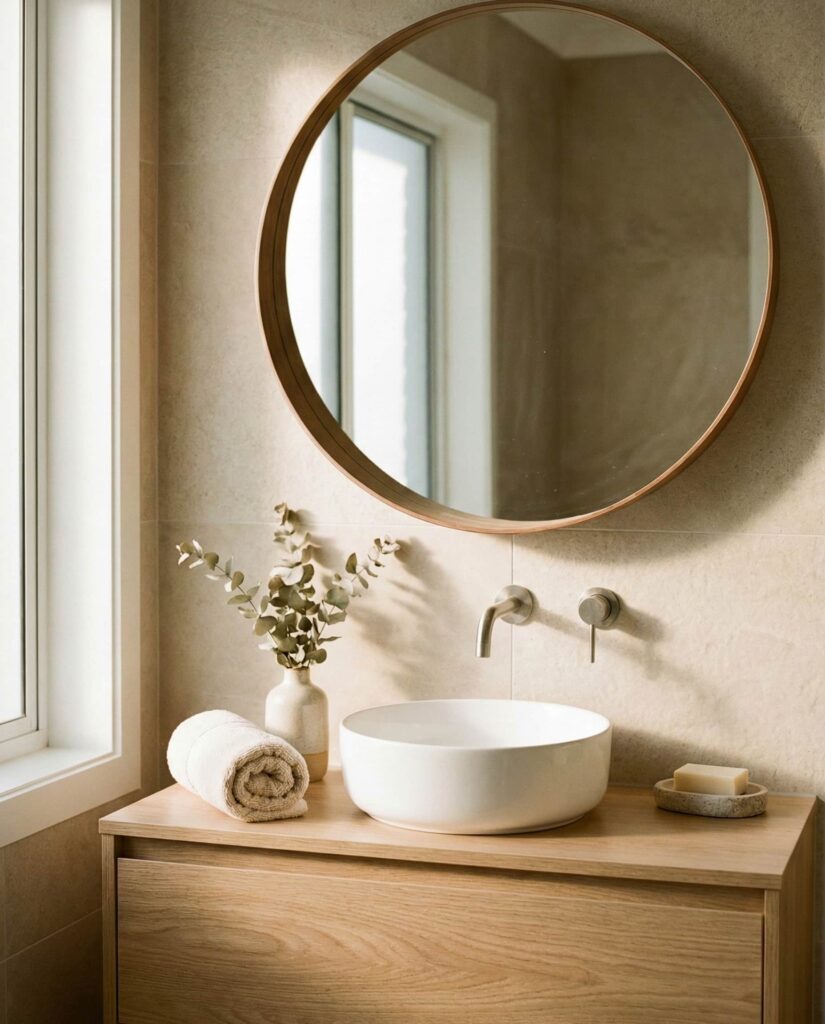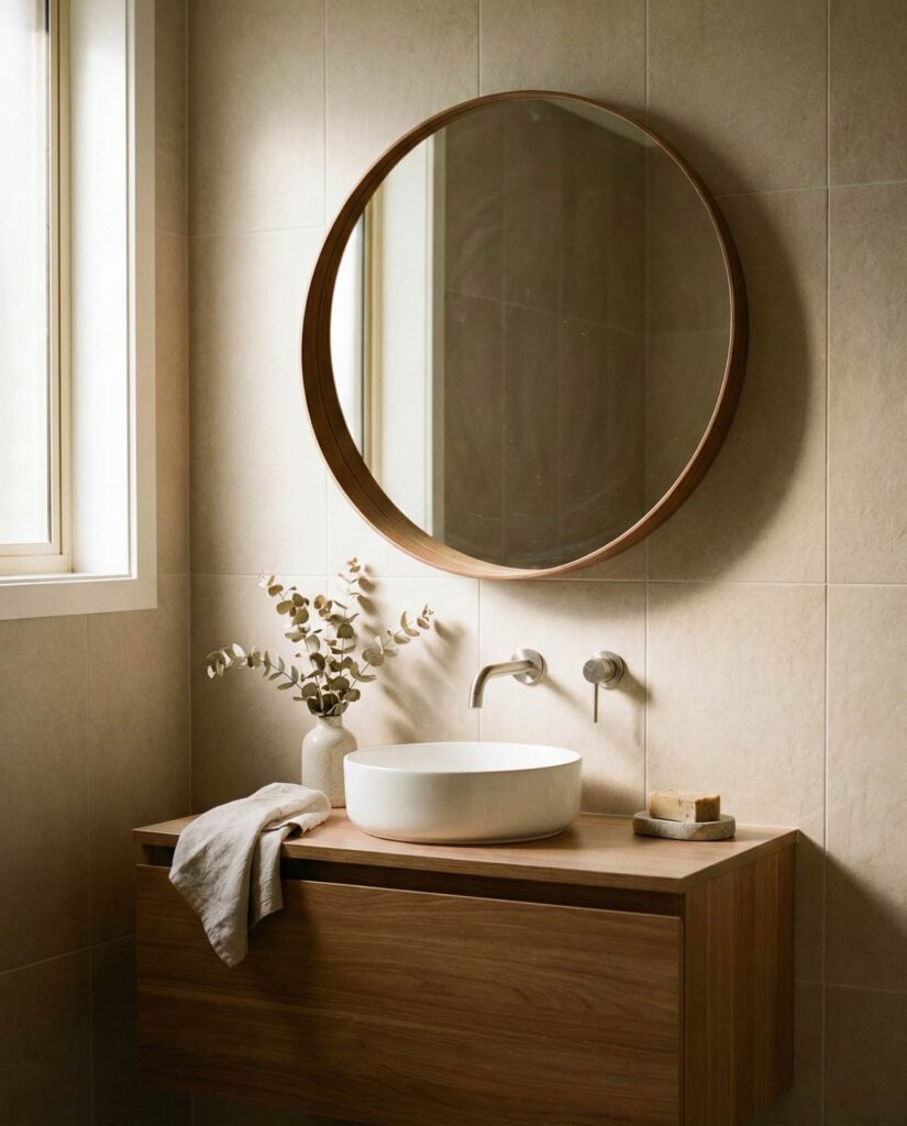 4. Circle Mirrors in Calm Bathroom Spaces