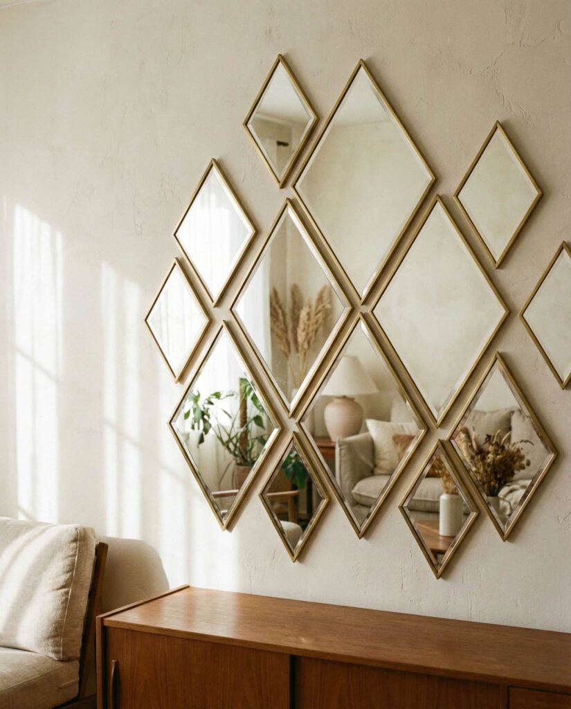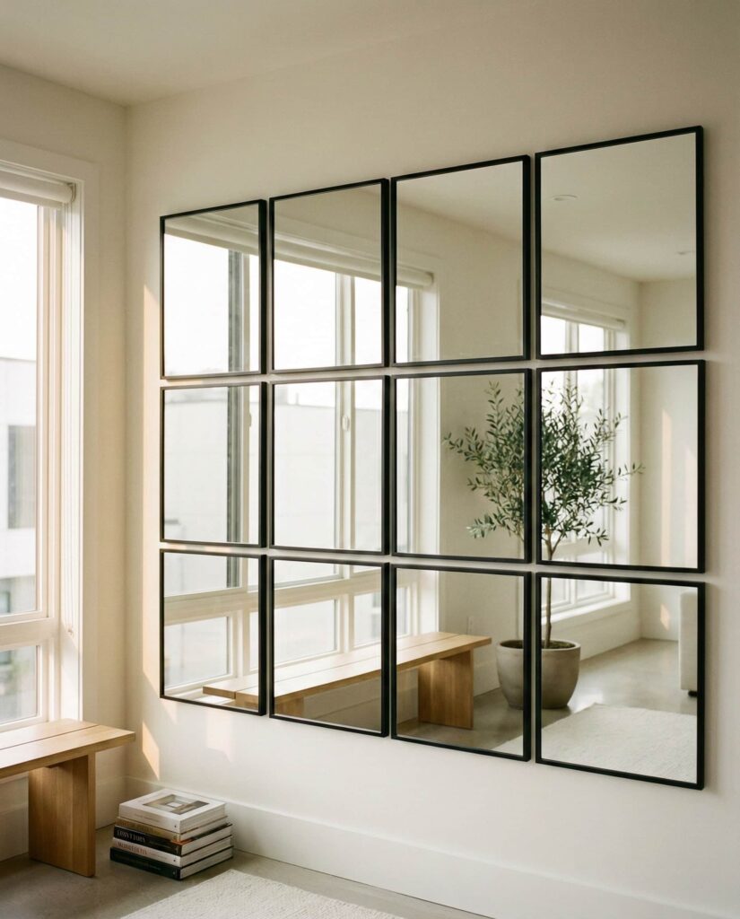 A Square mirror grid creates order and symmetry, often favored in modern homes. Installed evenly, it brings structure to open walls without adding bulk. I’ve seen this approach used successfully in apartments where art felt unnecessary. The repetition creates a clean visual rhythm that feels intentional. It’s a subtle way to enhance light and space simultaneously.