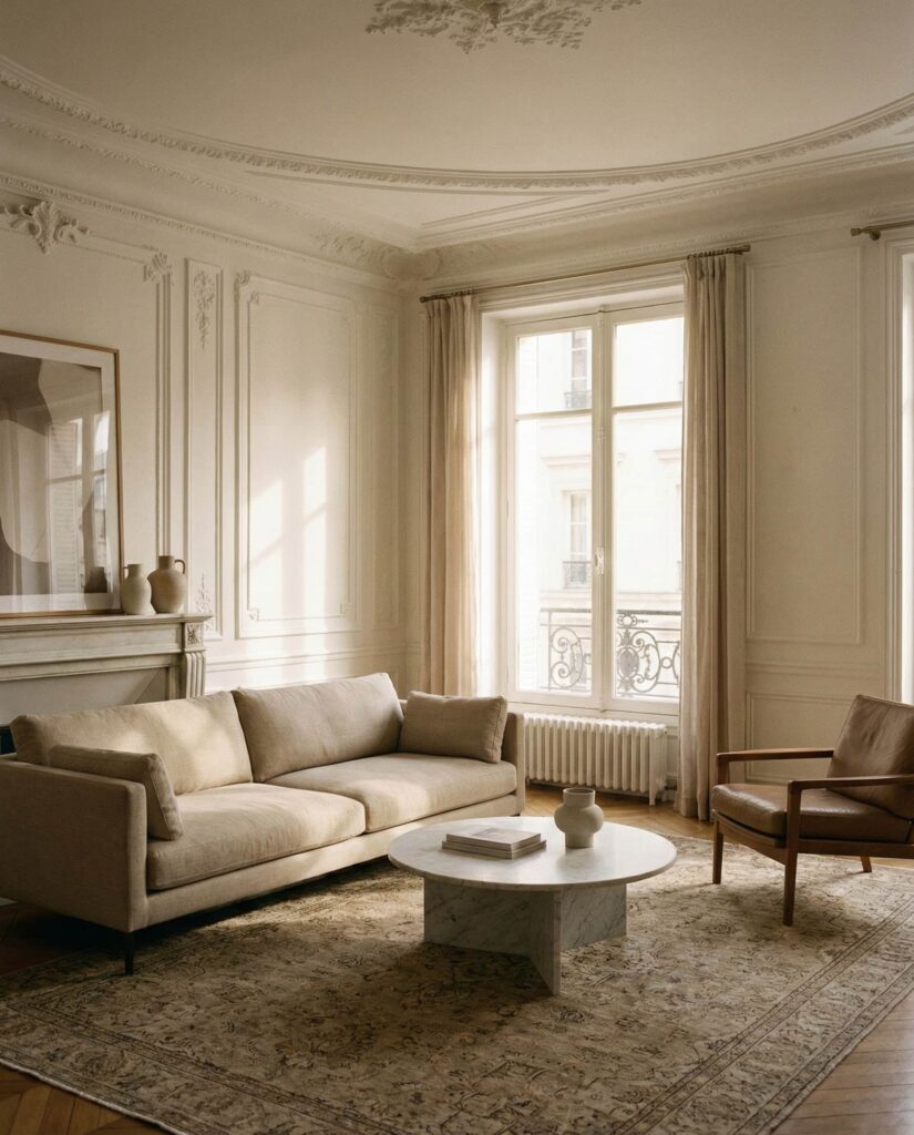 Blending Traditional elements into modern living rooms adds familiarity and warmth. Crown molding, symmetrical layouts, or classic textiles are updated through modern Designs and simplified color schemes. Designers from House Beautiful often recommend this approach for homeowners transitioning older homes into contemporary lifestyles. The result feels grounded yet fresh, honoring architectural history while supporting modern living. Paired with updated furniture and efficient lighting, this style bridges generations beautifully.