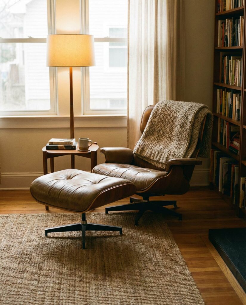 A dedicated reading corner reflects how modern living rooms now support slower moments. Drawing from Cozy mid century sensibilities, this idea pairs a classic lounge chair with warm wood tones and tactile fabrics. Designers at Dwell often highlight how small zones can transform large rooms into more intimate spaces. A floor lamp with soft lighting, a side table, and curated Decor create function without clutter. These corners feel personal and nostalgic, subtly referencing Vintage and Mid-century influences. Homeowners enjoy how such spaces encourage screen-free relaxation while fitting seamlessly into the overall Interior.