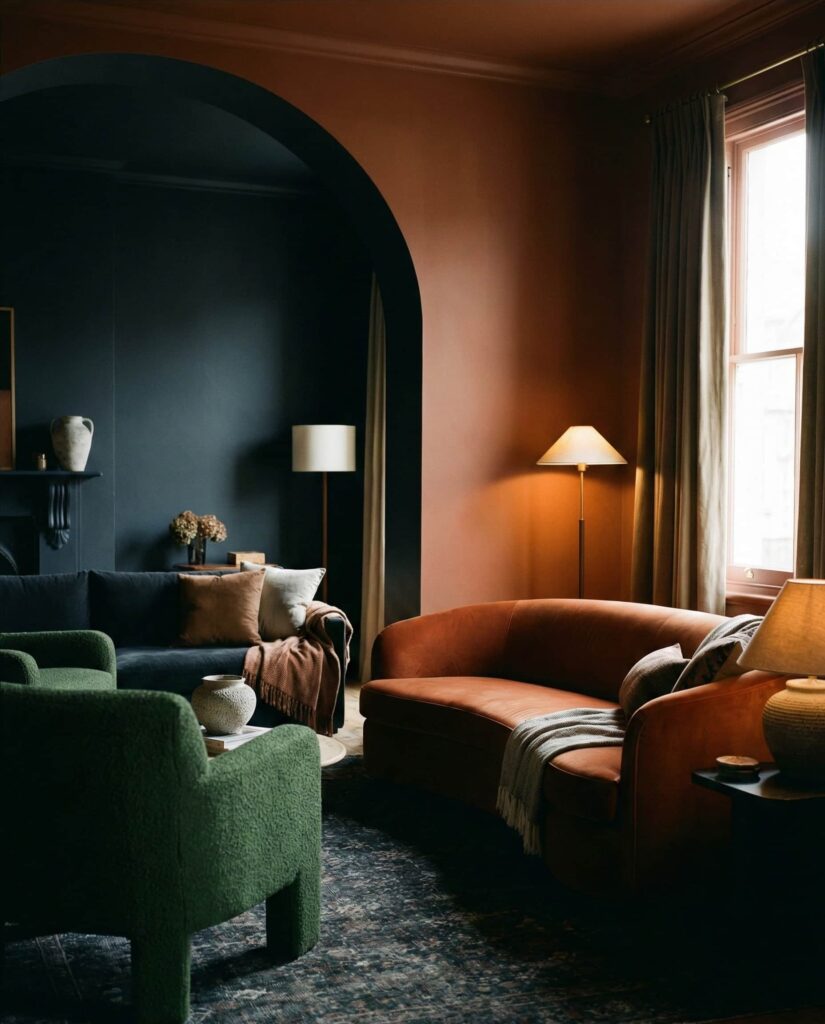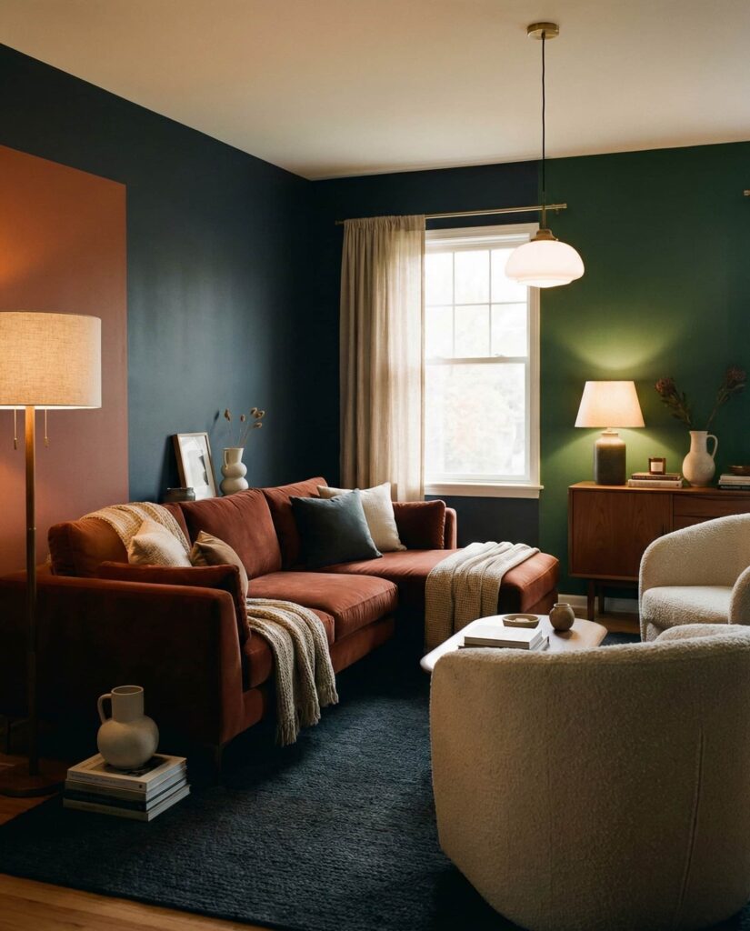 Moody color blocking is becoming a sophisticated way to add depth without chaos. Instead of sharp contrasts, designers now use tonal variations layered with Organic textures. Inspired by interiors seen on Elle Decor, this idea works especially well in modern living rooms with simple layouts. Deep greens, charcoals, or browns are balanced with plush furniture and woven Decor. Strategic lighting ceilings prevent the room from feeling heavy. The result is expressive yet livable, appealing to homeowners who want drama without sacrificing warmth.