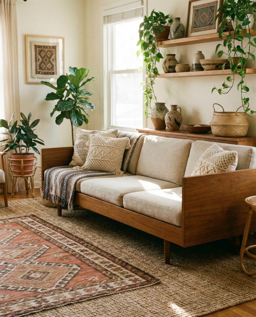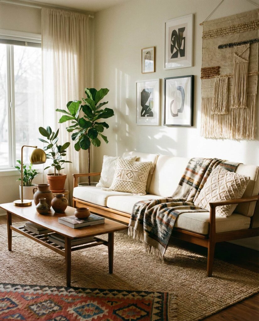 A Boho mid century living room allows personality to lead while still honoring structure. Popularized by creators on Apartment Therapy, this style mixes Boho ease with Mid-century clarity. Clean-lined seating provides a framework, while layered rugs, woven textiles, and collected art paintings bring warmth and individuality. This is where Decor becomes storytelling, often blending Vintage finds with handmade accents. The result feels relaxed, never rigid, and perfectly suited to renters and homeowners alike. A neutral base keeps the room grounded, while pops of color and Natural fibers add movement. Many designers see this as one of the most adaptable Ideas for modern living because it evolves easily over time. It’s less about perfection and more about comfort, creativity, and lived experience.