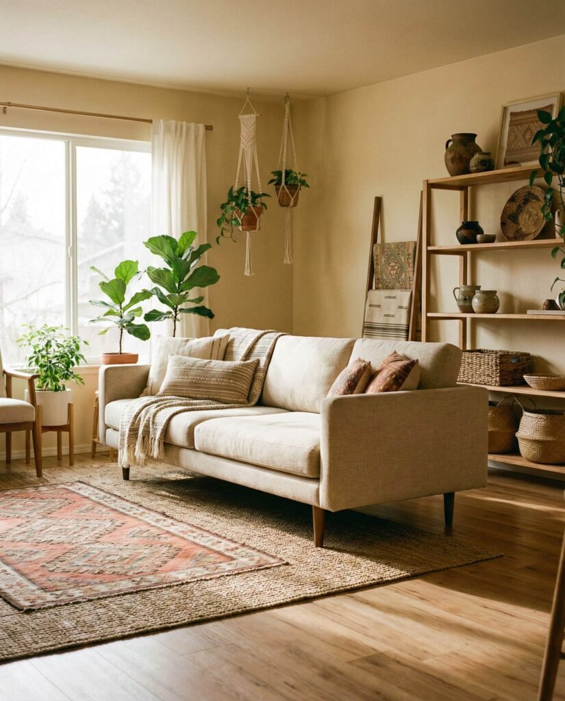 Modern Boho living rooms are becoming more structured, blending free-spirited Decor with clear architectural order. Editors at Apartment Therapy note that this balance prevents visual fatigue. Clean-lined furniture establishes flow, while layered rugs, ceramics, and plants add softness. This approach keeps the room playful but polished, making it suitable for shared family spaces. Subtle Natural tones and handcrafted accents reinforce authenticity. The result feels creative yet composed, appealing to homeowners who want character without clutter.