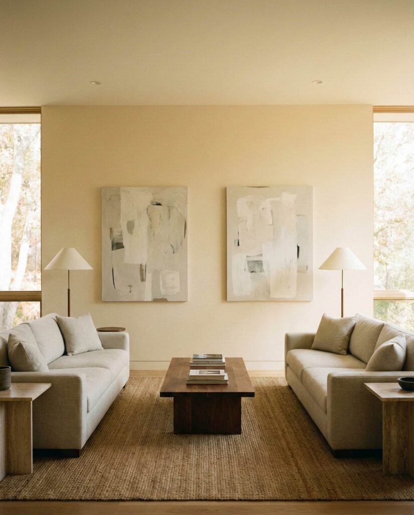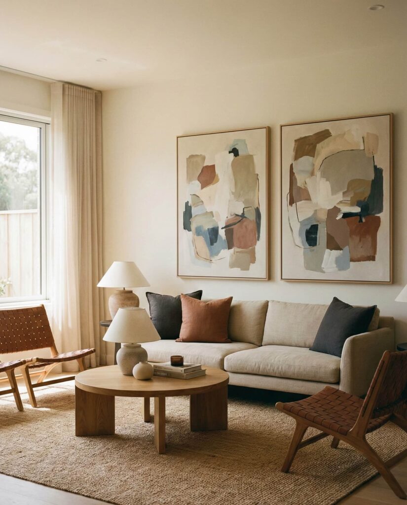 In this modern living room concept, art paintings guide how furniture is arranged rather than serving as an afterthought. Designers from Architectural Digest often emphasize starting with art to define scale, color, and emotional tone. Seating, rugs, and lighting are then positioned to frame and highlight the artwork naturally. This method results in cohesive design interiors where every element feels intentional. The space benefits from restrained Decor, allowing the art to remain the focal point while still supporting daily comfort. Homeowners appreciate how this idea brings personality into the room without excess, turning the living room into a reflection of taste rather than trends.