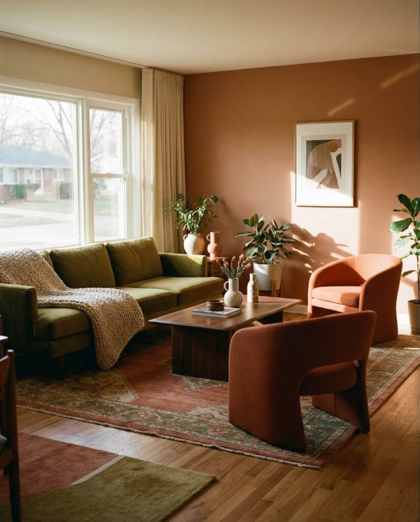This idea revisits Contemporary mid century style through warmer, more Earthy color stories. Instead of stark contrasts, designers now lean into clay tones, muted greens, and softened browns to refresh classic Mid century forms. According to Dwell, this palette shift makes Midcentury silhouettes feel more approachable and Cozy. Clean-lined furniture remains central, but tactile fabrics and layered Decor add comfort. The style feels grounded rather than nostalgic, appealing to homeowners who appreciate history without wanting a Retro look. This approach works especially well in everyday family living rooms where comfort and visual calm matter most.