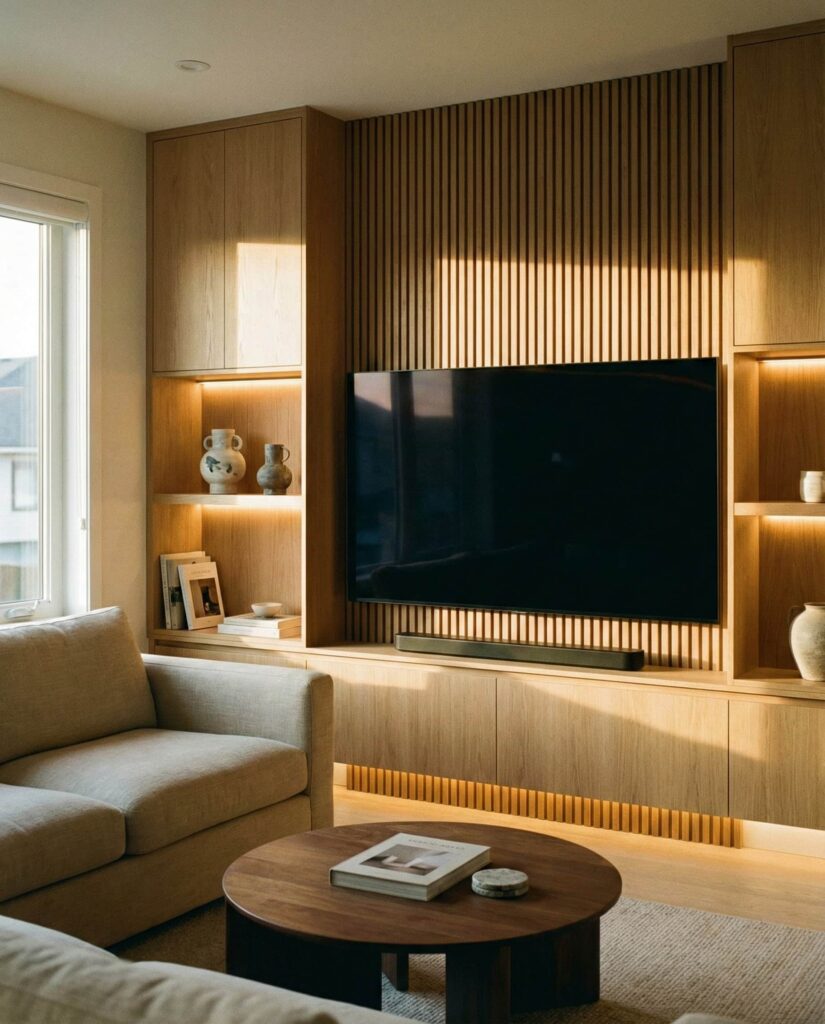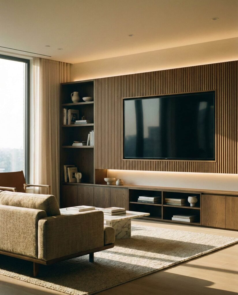 Wood-clad accent walls are redefining modern living rooms by adding warmth and character. This idea, frequently featured on Architectural Digest, uses vertical or slatted wood to enhance scale and rhythm. Unlike Rustic applications, the finish here is refined and contemporary. Paired with streamlined Designs and neutral Decor, wood walls become a subtle focal point. They work well behind seating areas or tv wall installations, grounding technology with Natural texture. Homeowners value how this feature improves acoustics and visual comfort at the same time.