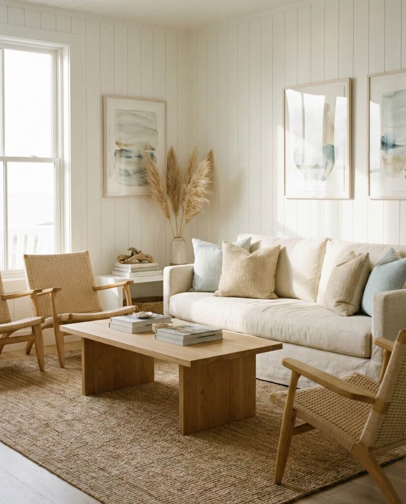 The Coastal living room of today is refined, not themed. Designers highlighted on Elle Decor emphasize restraint, using Natural light, soft blues, and sandy neutrals to evoke ease without clichés. Modern Designs keep the space crisp, while linen upholstery and light wood furniture add warmth. This style suits urban apartments and suburban homes alike, offering a mental escape without overt nautical references. The atmosphere feels open and breathable, ideal for everyday living. Many homeowners gravitate toward this look for its versatility and timeless appeal, especially when paired with subtle art paintings and organic textures.