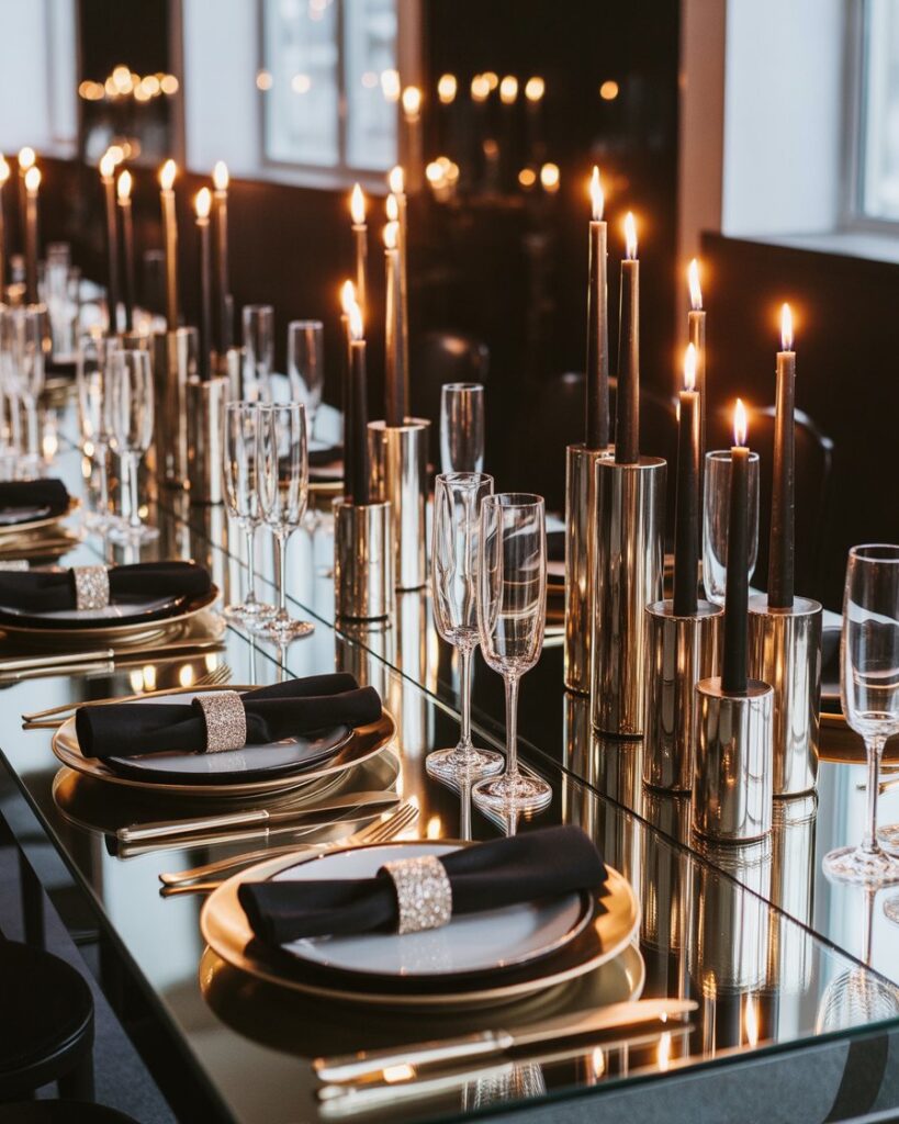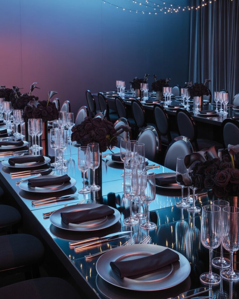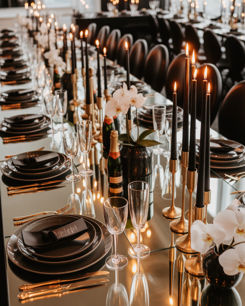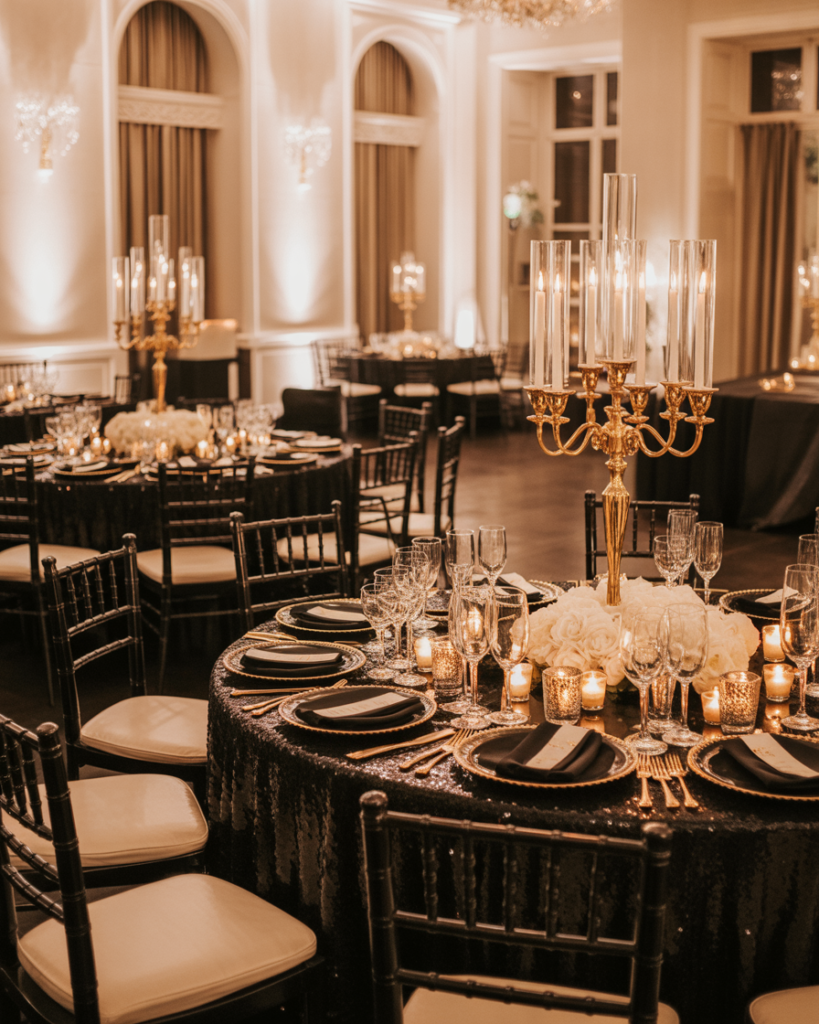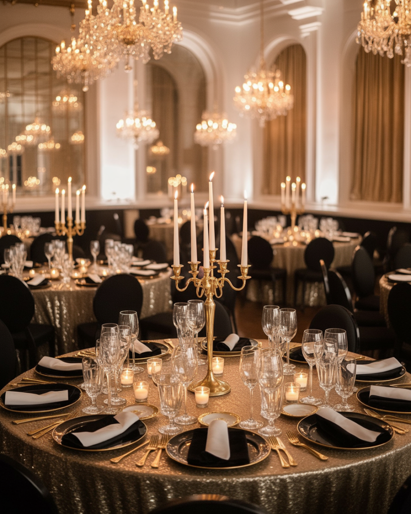 When it comes to decorations, metallic colors like gold and champagne bring warmth and grandeur to any winter venue. A shimmering color palette mixed with black accents captures that timeless black tie aesthetic. Think sequined tablecloths and candlelit centerpieces that gleam like New Year fireworks — a look that design icons at The Knot say “sets the tone for celebration.”