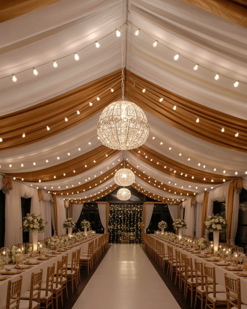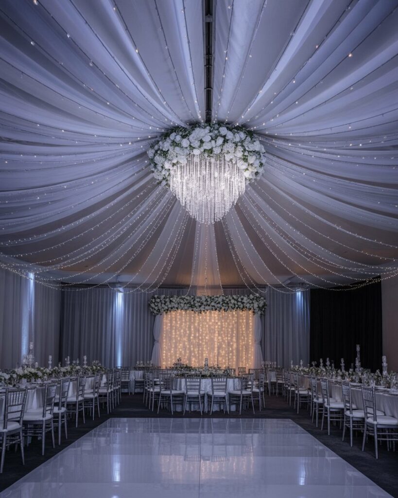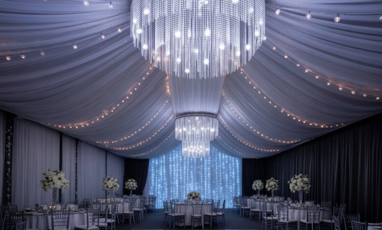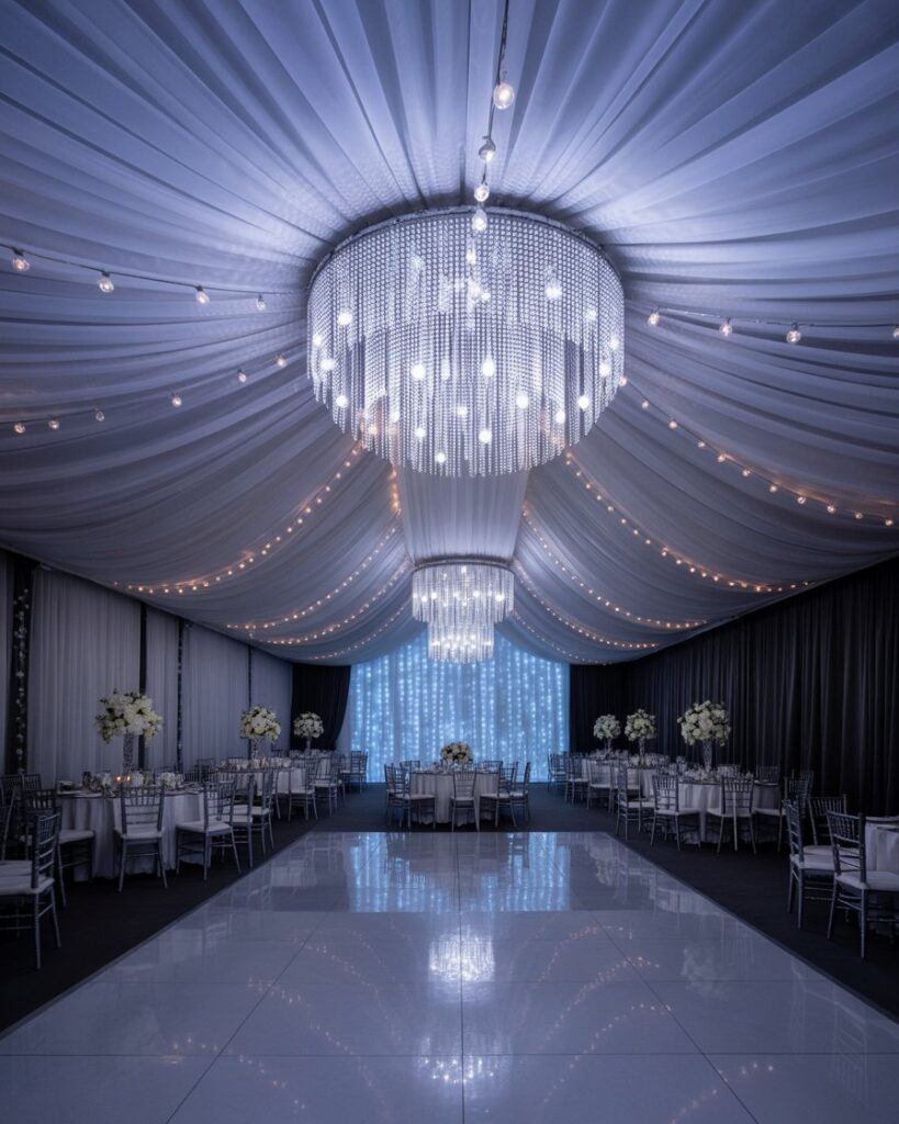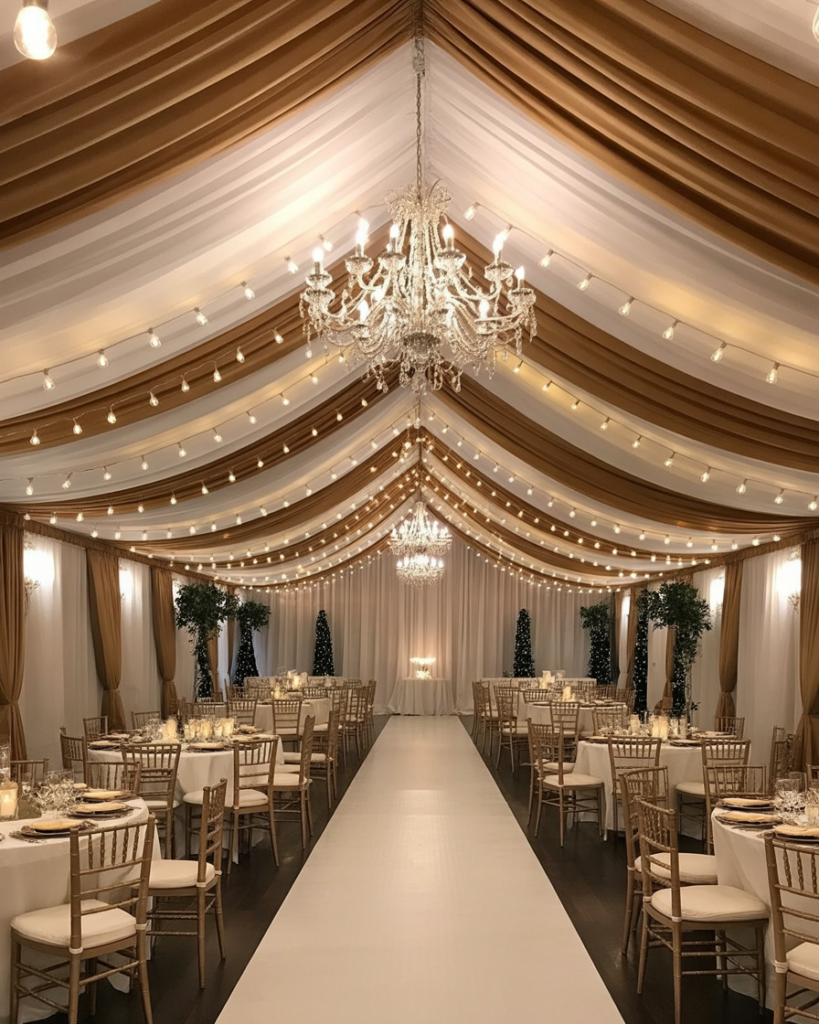 Nothing transforms a reception space faster than dramatic ceiling drapes. Flowing fabrics in ivory, gold, or black instantly elevate the aesthetic and define your color palette. Add fairy lights woven through the fabric to make the whole venue glow as midnight approaches. These decorations add depth, romance, and luxury—perfect for your New Year’s Eve party.