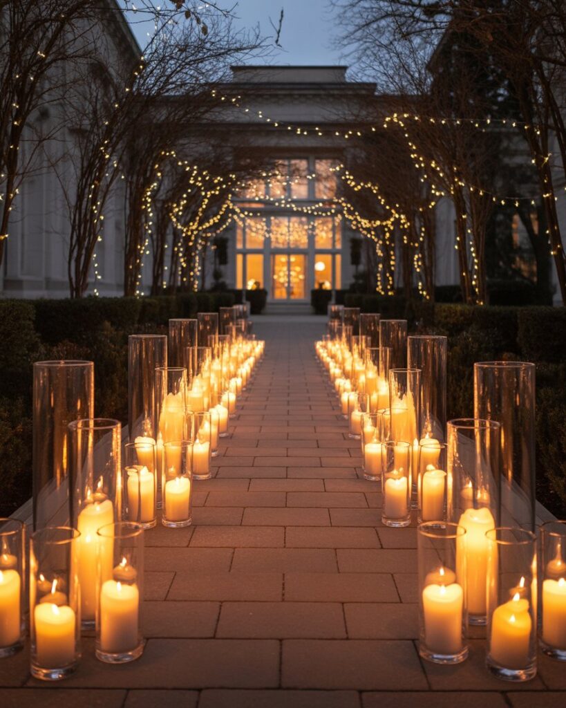 Guide every guest into your venue with an aisle lined with candles in glass cylinders. It’s simple but unforgettable. This aesthetic touch adds warmth and intimacy, especially when paired with gold or ivory colors. Designers at Brides.com often recommend this look for cozy winter celebrations.