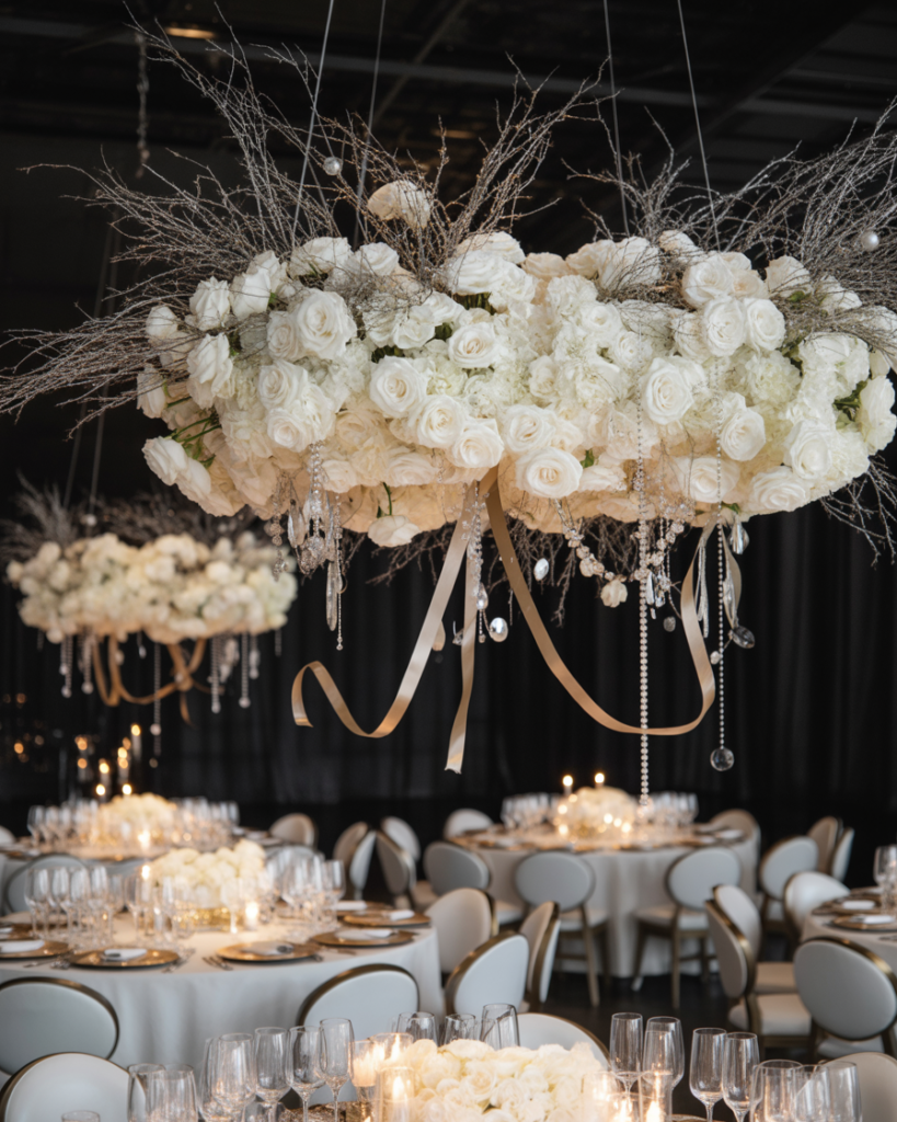 Floating flowers suspended from the ceiling bring a magical, airy feeling to your space. Combine white roses with silver-painted branches for elegant ideas decorations. The effect enhances your table decor and draws eyes upward, creating a balanced, luxurious composition for the celebration.