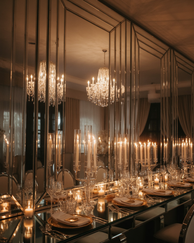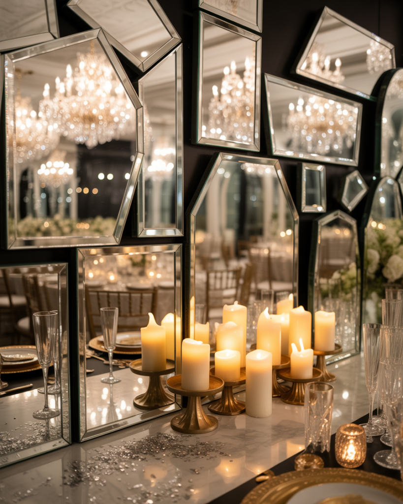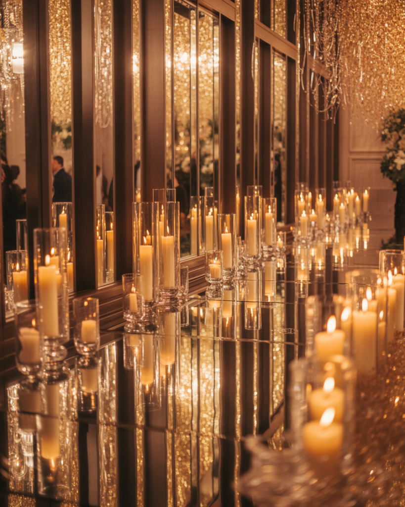 Add mirrored panels or reflective backdrops to amplify light in your reception area. Mirrors reflect candles, chandeliers, and centerpieces, creating infinite shimmer. This trend, praised by Harper’s Bazaar Weddings, adds instant sophistication and pairs beautifully with a metallic color palette.