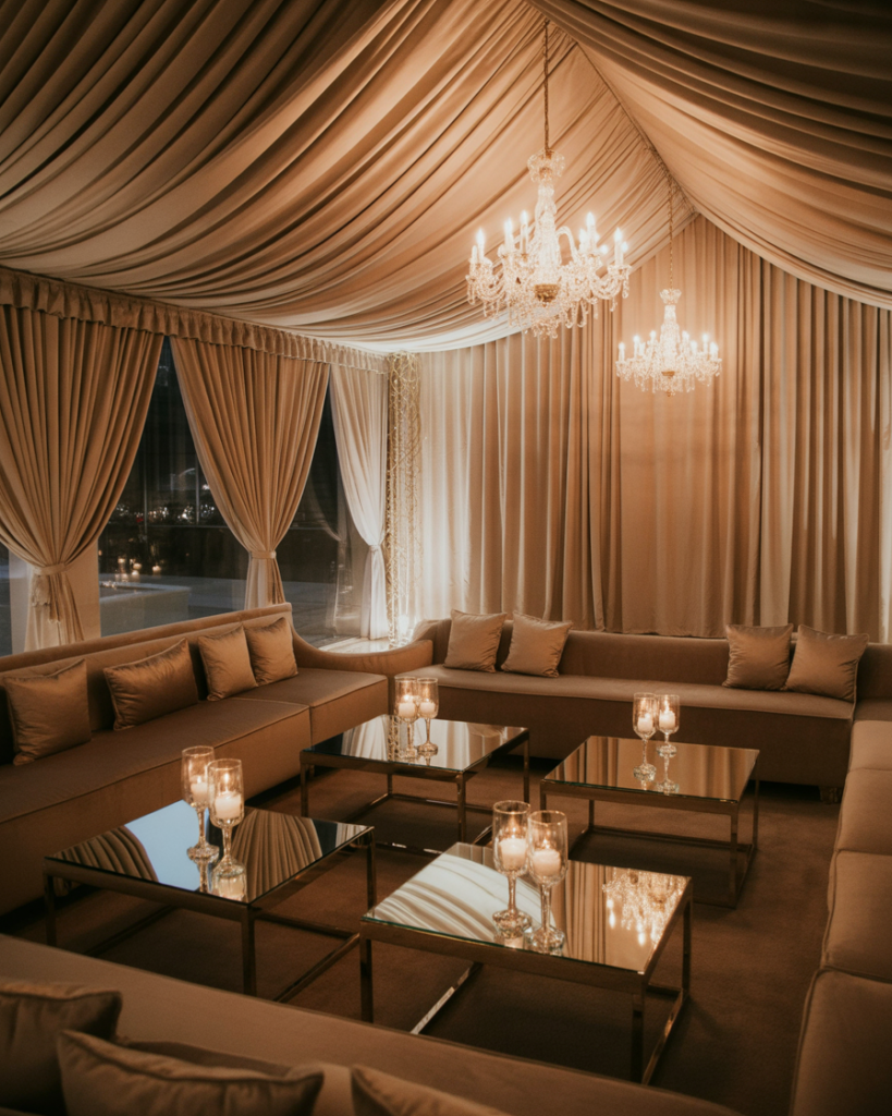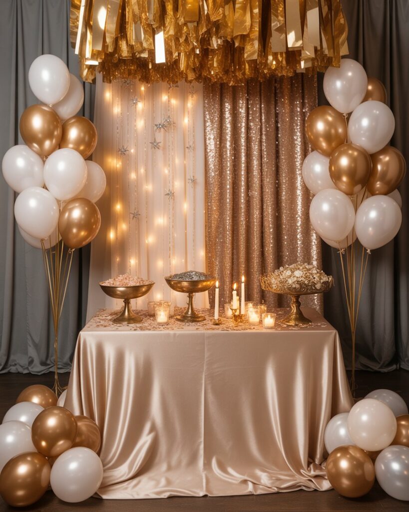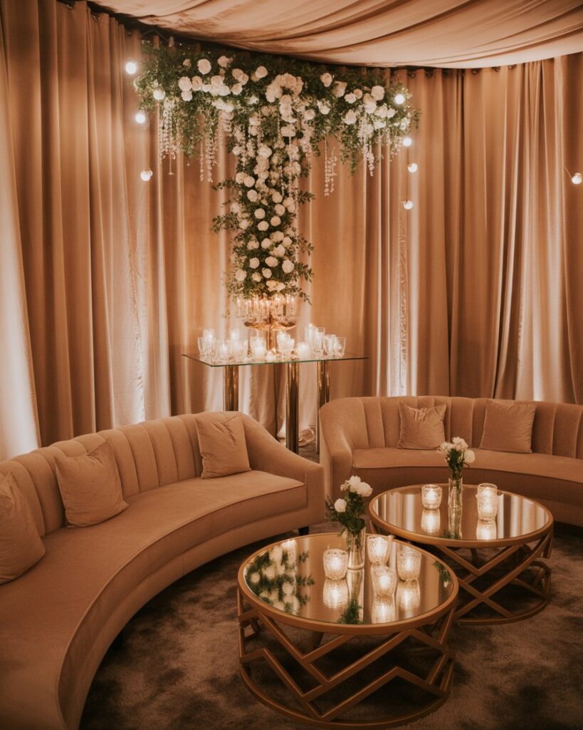 Create elegant lounge areas with plush chairs and gold-tinted drapery — a chic way for every guest to relax during the party. Add mirrored tables, crystal centerpieces, and warm champagne hues for sophistication. Ideas decorations like these encourage conversation and photo moments, adding comfort and charm.