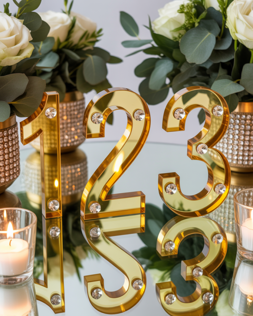Turn practical elements into décor. Add crystal-encrusted or gold acrylic seating chart numbers that complement your table decor. This small idea enhances the entire visual harmony and connects with your centerpieces and flowers for a unified, upscale design.