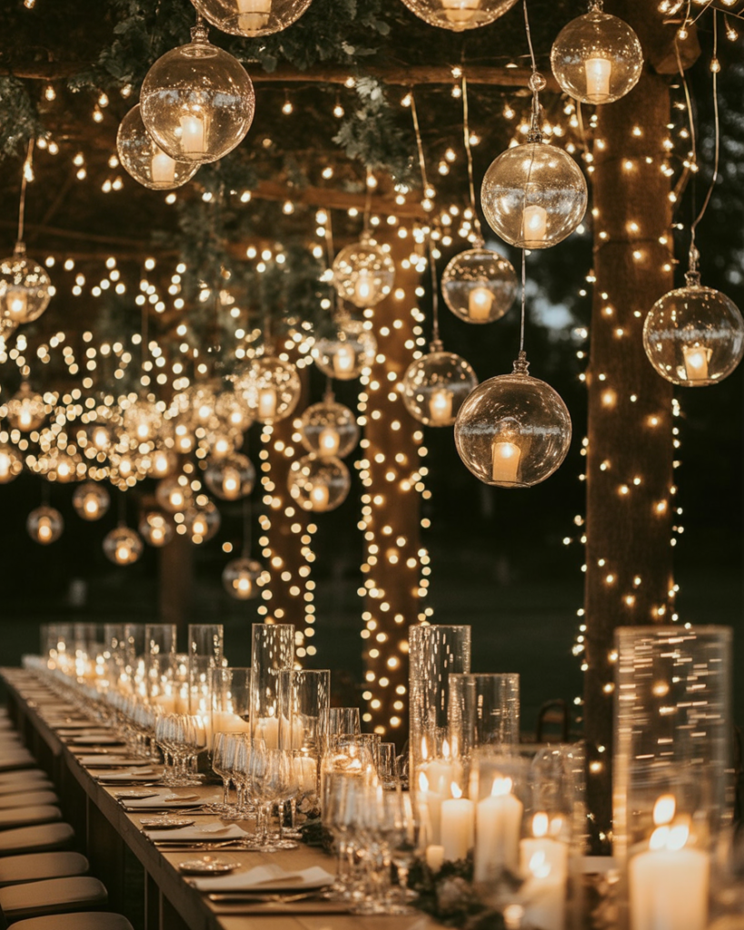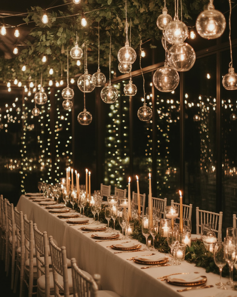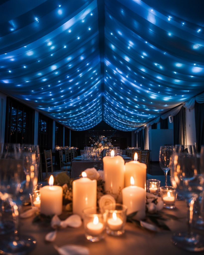 Lighting defines the night’s aesthetic. Use fairy lights, hanging glass globes, and candle clusters to make the venue shimmer like stars. Interior stylist Emily Henderson recommends mixing warm white and cool tones for contrast. Lighting enhances not just mood but also highlights centerpieces, table decor, and your colors.