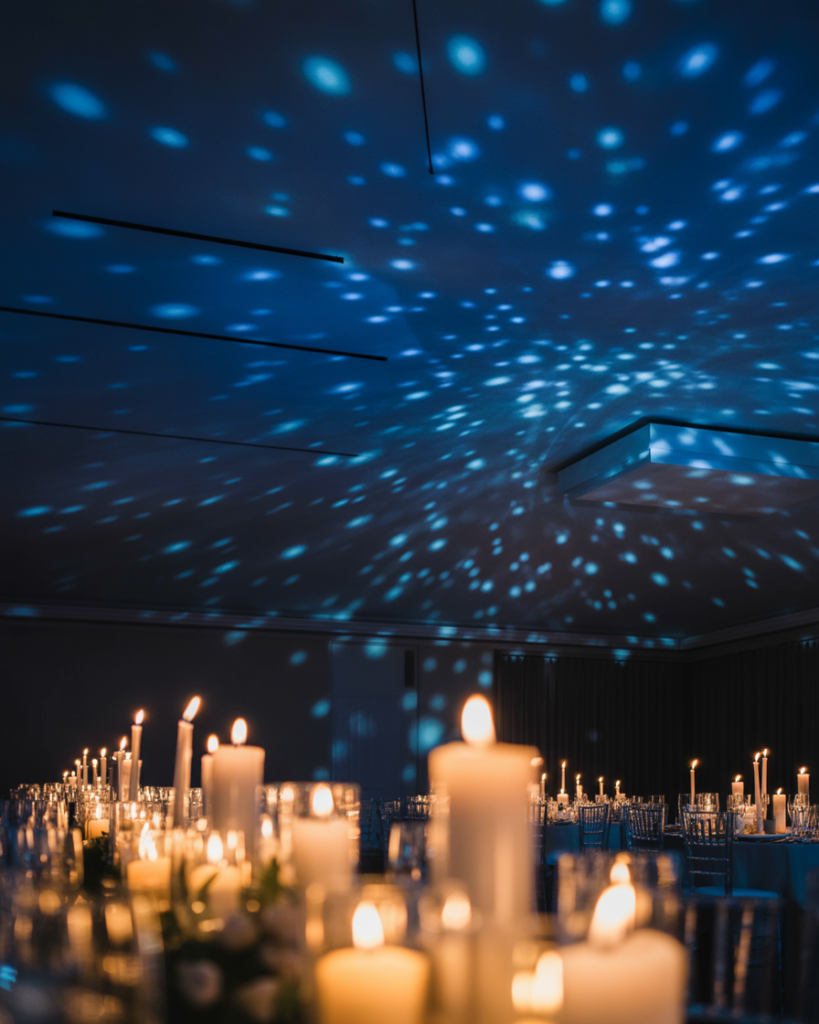 Use soft projection mapping to cast moving stars and light waves across the ceiling. This modern aesthetic creates an immersive experience and perfectly suits the New Year’s reception. Pair with navy-blue colors and candlelit tables to balance technology with warmth.