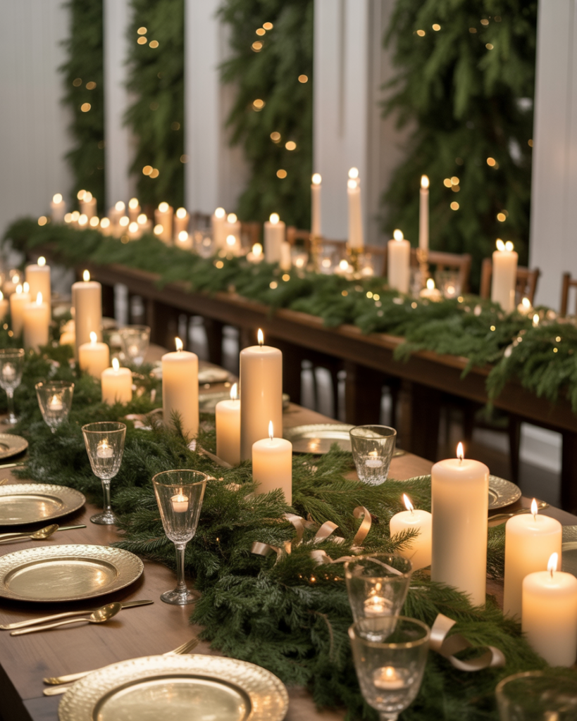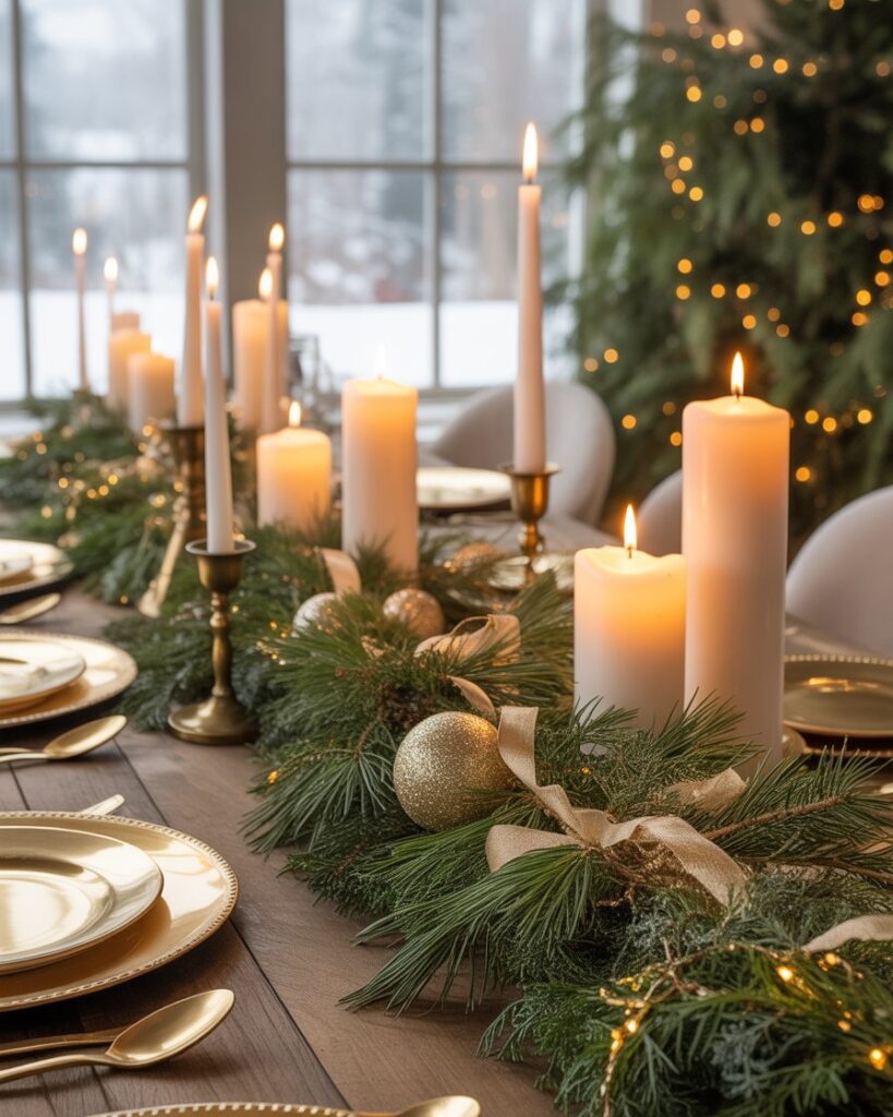 Add evergreen garlands and pine sprigs to chandeliers and tables. These natural decorations offer a cozy yet elegant contrast to metallic colors. Interior decorators like Nate Berkus say such greenery gives balance and freshness to festive centerpieces and table decor.